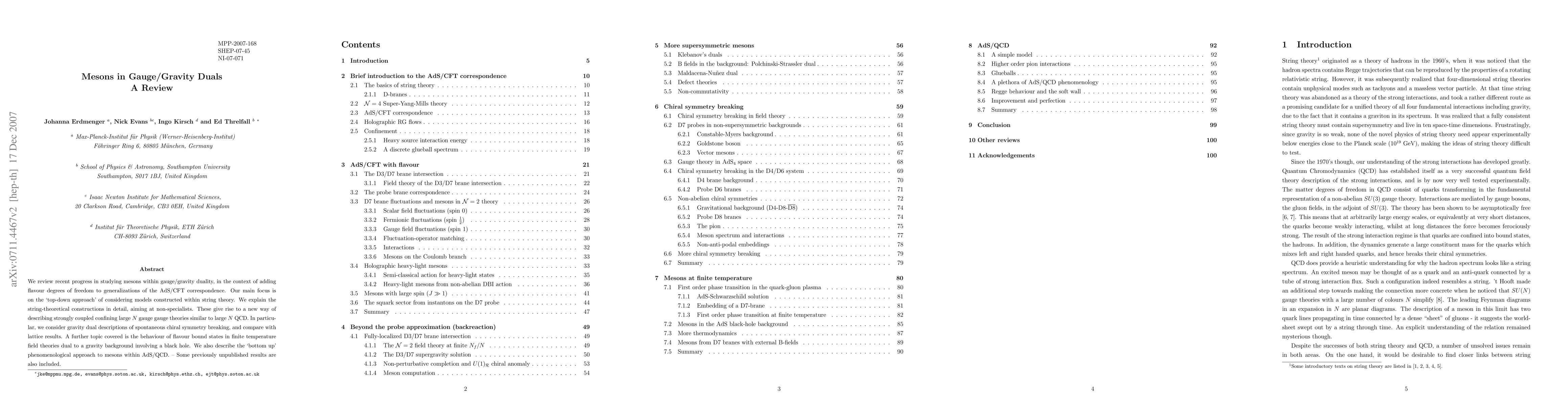 This paper reviews advancements in studying mesons via gauge/gravity duality, particularly focusing on string theory models that offer new insights into strongly coupled gauge theories akin to large N QCD. It includes detailed string-theoretical constructions and comparisons with lattice results, alongside analyses of meson behavior in finite temperature field theories.