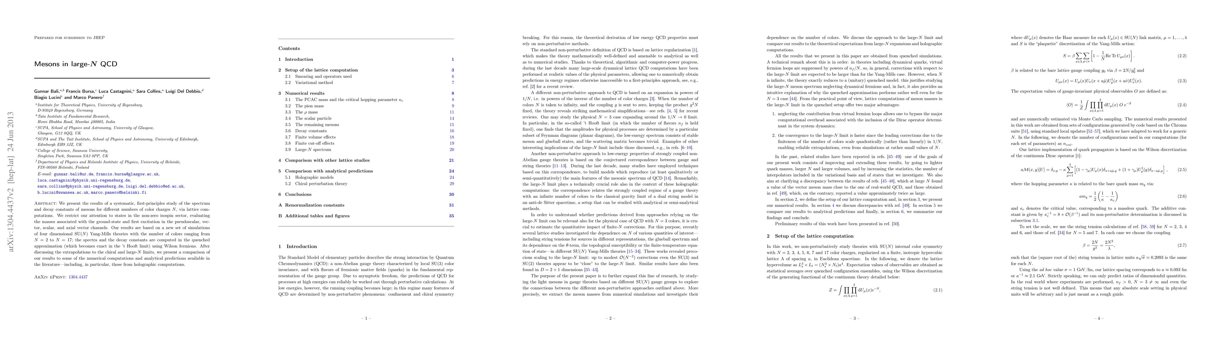 We present the results of a systematic, first-principles study of the spectrum and decay constants of mesons for different numbers of color charges N, via lattice computations. We restrict our attention to states in the non-zero isospin sector, evaluating the masses associated with the ground-state and first excitation in the pseudoscalar, vector, scalar, and axial vector channels. Our results are based on a new set of simulations of four dimensional SU(N) Yang-Mills theories with the number of colors ranging from N=2 to N=17; the spectra and the decay constants are computed in the quenched approximation (which becomes exact in the 't Hooft limit) using Wilson fermions. After discussing the extrapolations to the chiral and large-N limits, we present a comparison of our results to some of the numerical computations and analytical predictions available in the literature - including, in particular, those from holographic computations.