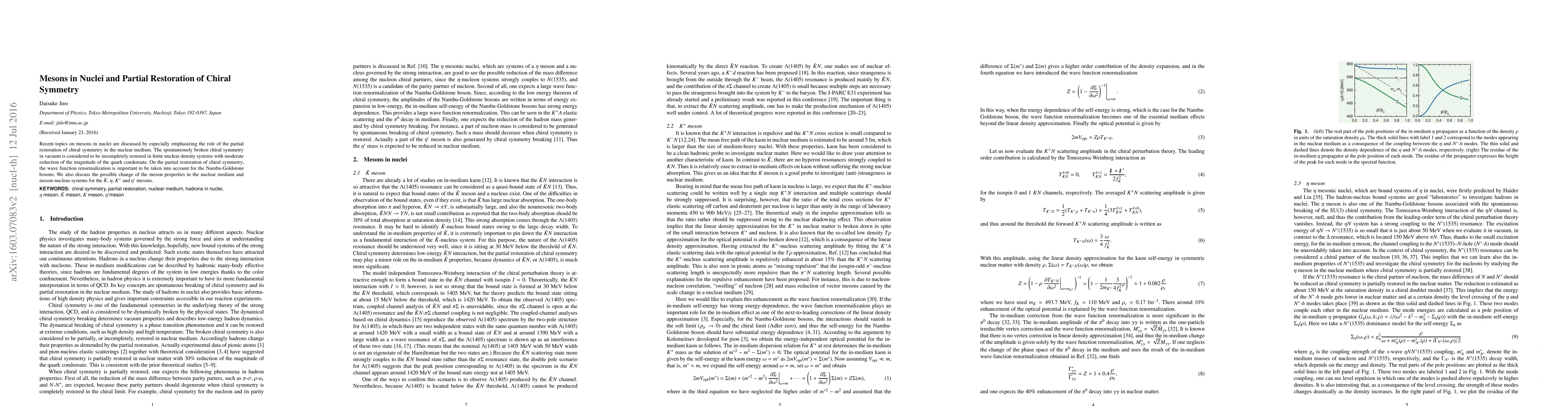 This paper explores the behavior of mesons in nuclear environments, focusing on the partial restoration of chiral symmetry and its implications. It highlights the reduction in the quark condensate and the significance of wave function renormalization for Nambu-Goldstone bosons, while also examining changes in properties of specific mesons like $\bar K$, $\eta$, $K^{+}$, and $\eta^{\prime}$ in nuclear medium.