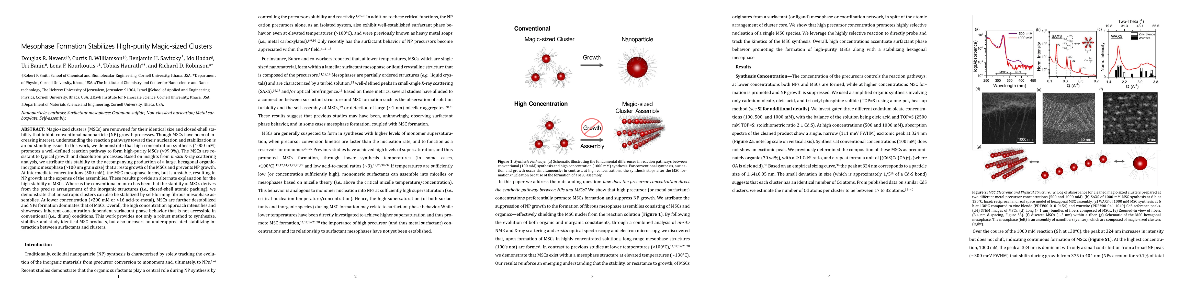 Magic-sized clusters (MSCs) are renowned for their identical size and closed-shell stability that inhibit conventional nanoparticle (NP) growth processes. Though MSCs have been of increasing interest, understanding the reaction pathways toward their nucleation and stabilization is an outstanding issue. In this work, we demonstrate that high concentration synthesis (1000 mM) promotes a well-defined reaction pathway to form high-purity MSCs (greater than 99.9 percent). The MSCs are resistant to typical growth and dissolution processes. Based on insights from in-situ X-ray scattering analysis, we attribute this stability to the accompanying production of a large, hexagonal organic-inorganic mesophase (greater than 100 nm grain size) that arrests growth of the MSCs and prevents NP growth. At intermediate concentrations (500 mM), the MSC mesophase forms, but is unstable, resulting in NP growth at the expense of the assemblies. These results provide an alternate explanation for the high stability of MSCs. Whereas the conventional mantra has been that the stability of MSCs derives from the precise arrangement of the inorganic structures (i.e., closed-shell atomic packing), we demonstrate that anisotropic clusters can also be stabilized by self-forming fibrous mesophase assemblies. At lower concentration (less than 200 mM or greater than 16 acid-to-metal), MSCs are further destabilized and NPs formation dominates that of MSCs. Overall, the high concentration approach intensifies and showcases inherent concentration-dependent surfactant phase behavior that is not accessible in conventional (i.e., dilute) conditions. This work provides not only a robust method to synthesize, stabilize, and study identical MSC products, but also uncovers an underappreciated stabilizing interaction between surfactants and clusters.
