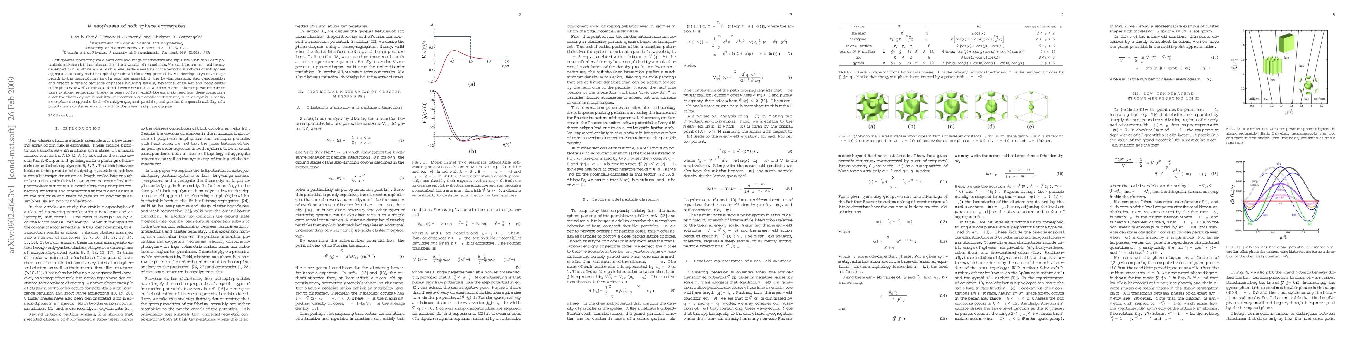 This paper investigates the mesophases formed by soft-sphere aggregates using a mean field theory combined with lattice model analysis. It predicts a sequence of stable morphologies including lamella, hexagonal-columnar, and body-center cubic phases, and discusses the thermodynamic stability of bicontinuous structures like the gyroid under finite-temperature corrections.