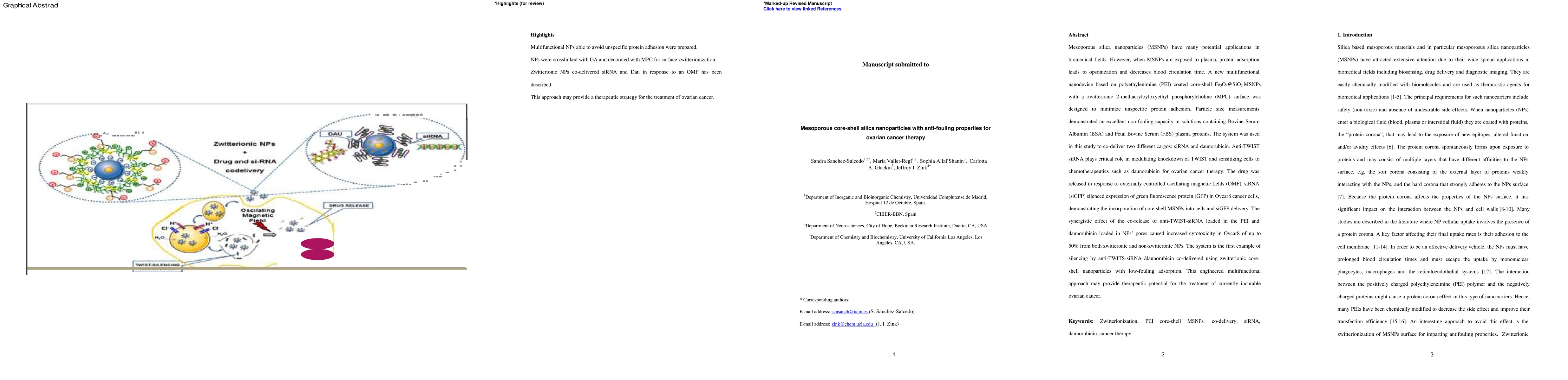 Mesoporous silica nanoparticles (MSNPs) have many potential applications in biomedical fields. However, when MSNPs are exposed to plasma, protein adsorption leads to opsonization and decreases blood circulation time. A new multifunctional nanodevice based on polyethylenimine (PEI) coated core-shell Fe3O4@SiO2 MSNPs with a zwitterionic 2-methacryloyloxyethyl phosphorylcholine (MPC) surface was designed to minimize unspecific protein adhesion. Particle size measurements demonstrated an excellent non-fouling capacity in solutions containing Bovine Serum Albumin (BSA) and Fetal Bovine Serum (FBS) plasma proteins. The system was used in this study to co-deliver two different cargos: siRNA and daunorubicin. Anti-TWIST siRNA plays critical role in modulating knockdown of TWIST and sensitizing cells to chemotherapeutics such as daunorubicin for ovarian cancer therapy. The drug was released in response to externally controlled oscillating magnetic fields (OMF). siRNA (siGFP) silenced expression of green fluorescence protein (GFP) in Ovcar8 cancer cells, demonstrating the incorporation of core shell MSNPs into cells and siGFP delivery. The synergistic effect of the co-release of anti-TWIST-siRNA loaded in the PEI and daunorubicin loaded in NPs pores c aused increased cytotoxicity in Ovcar8 of up to 50% from both zwitteronic and non-zwitteronic NPs. The system is the first example of silencing by anti-TWITS-siRNA /daunorubicin co-delivered using zwitterionic core-shell nanoparticles with low-fouling adsorption. This engineered multifunctional approach may provide therapeutic potential for the treatment of currently incurable ovarian cancer.