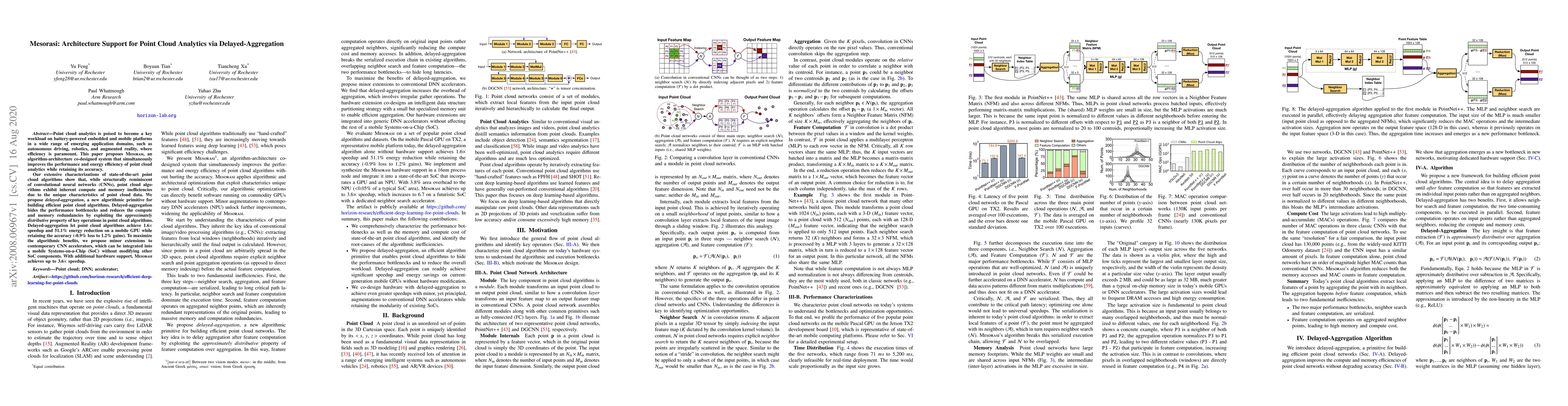 This paper introduces Mesorasi, a co-designed system for enhancing the performance and energy efficiency of point cloud analytics on battery-powered devices. It proposes delayed-aggregation to address compute and memory inefficiencies inherent in point cloud algorithms, achieving significant improvements in speed and energy reduction while maintaining accuracy.