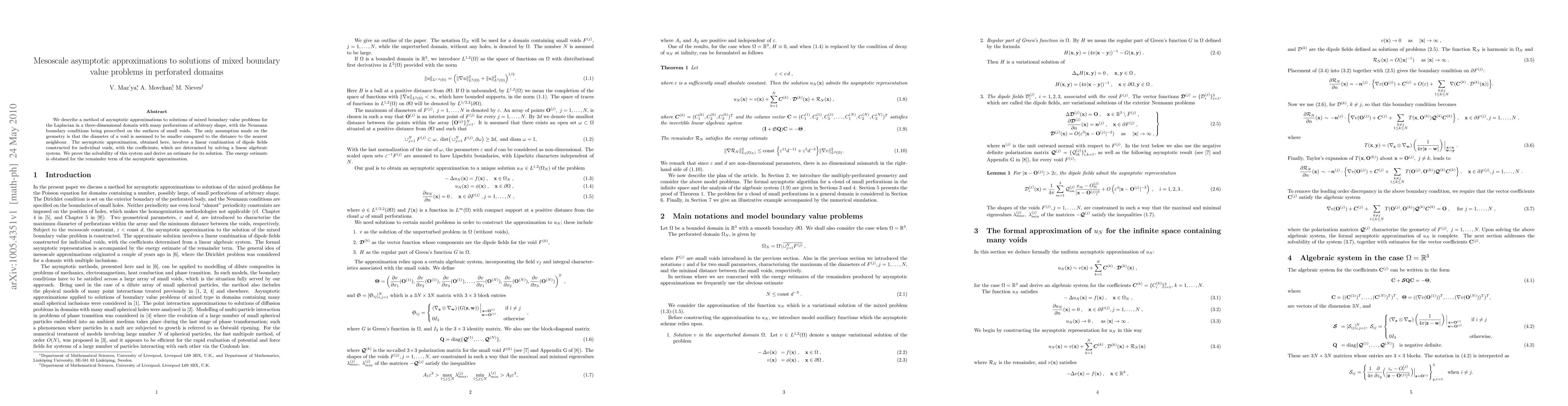 We describe a method of asymptotic approximations to solutions of mixed boundary value problems for the Laplacian in a three-dimensional domain with many perforations of arbitrary shape, with the Neumann boundary conditions being prescribed on the surfaces of small voids. The only assumption made on the geometry is that the diameter of a void is assumed to be smaller compared to the distance to the nearest neighbour. The asymptotic approximation, obtained here, involves a linear combination of dipole fields constructed for individual voids, with the coefficients, which are determined by solving a linear algebraic system. We prove the solvability of this system and derive an estimate for its solution. The energy estimate is obtained for the remainder term of the asymptotic approximation.
