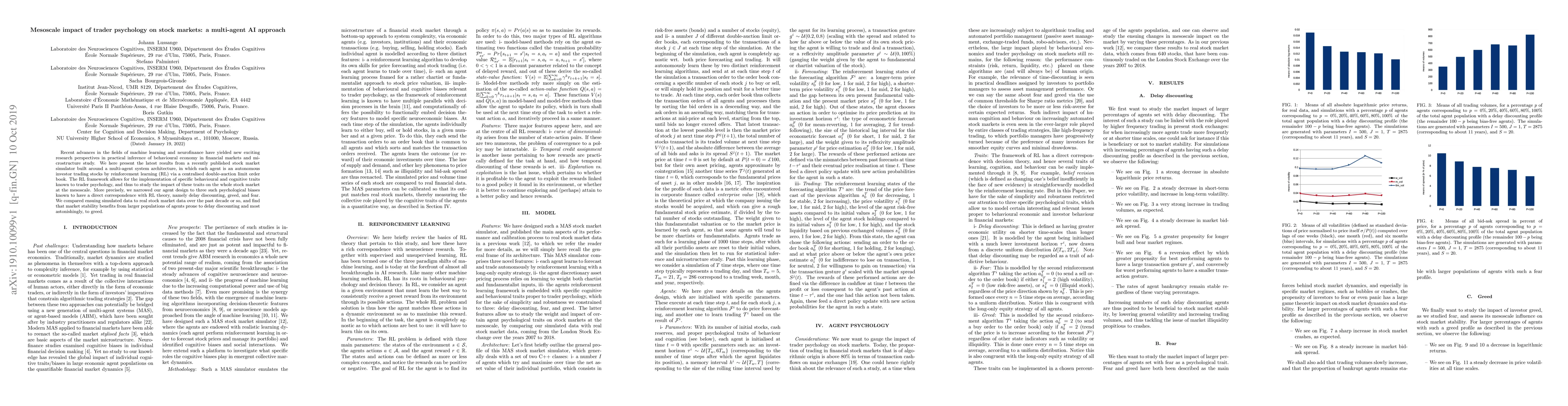 Recent advances in the fields of machine learning and neurofinance have yielded new exciting research perspectives in practical inference of behavioural economy in financial markets and microstructure study. We here present the latest results from a recently published stock market simulator built around a multi-agent system architecture, in which each agent is an autonomous investor trading stocks by reinforcement learning (RL) via a centralised double-auction limit order book. The RL framework allows for the implementation of specific behavioural and cognitive traits known to trader psychology, and thus to study the impact of these traits on the whole stock market at the mesoscale. More precisely, we narrowed our agent design to three such psychological biases known to have a direct correspondence with RL theory, namely delay discounting, greed, and fear. We compared ensuing simulated data to real stock market data over the past decade or so, and find that market stability benefits from larger populations of agents prone to delay discounting and most astonishingly, to greed.