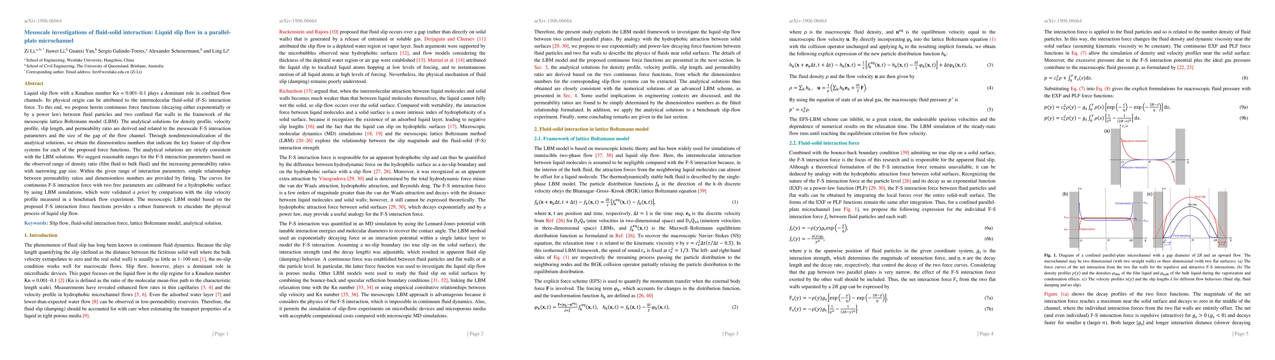 Liquid slip flow with a Knudsen number Kn = 0.001-0.1 plays a dominant role in confined flow channels. Its physical origin can be attributed to the intermolecular fluid-solid (F-S) interaction force. To this end, we propose herein continuous force functions (decaying either exponentially or by a power law) between fluid particles and two confined flat walls in the framework of the mesoscopic lattice Boltzmann model (LBM). The analytical solutions for density profile, velocity profile, slip length, and permeability ratio are derived and related to the mesoscale F-S interaction parameters and the size of the gap of the flow channel. Through nondimensionalization of the analytical solutions, we obtain the dimensionless numbers that indicate the key feature of slip-flow systems for each of the proposed force functions. The analytical solutions are strictly consistent with the LBM solutions. We suggest reasonable ranges for the F-S interaction parameters based on the observed range of density ratio (film fluid to bulk fluid) and the increasing permeability ratios with narrowing gap size. Within the given range of interaction parameters, simple relationships between permeability ratios and dimensionless numbers are provided by fitting. The curves for continuous F-S interaction force with two free parameters are calibrated for a hydrophobic surface by using LBM simulations, which were validated a priori by comparison with the slip velocity profile measured in a benchmark flow experiment. The mesoscopic LBM model based on the proposed F-S interaction force functions provides a robust framework to elucidate the physical process of liquid slip flow.