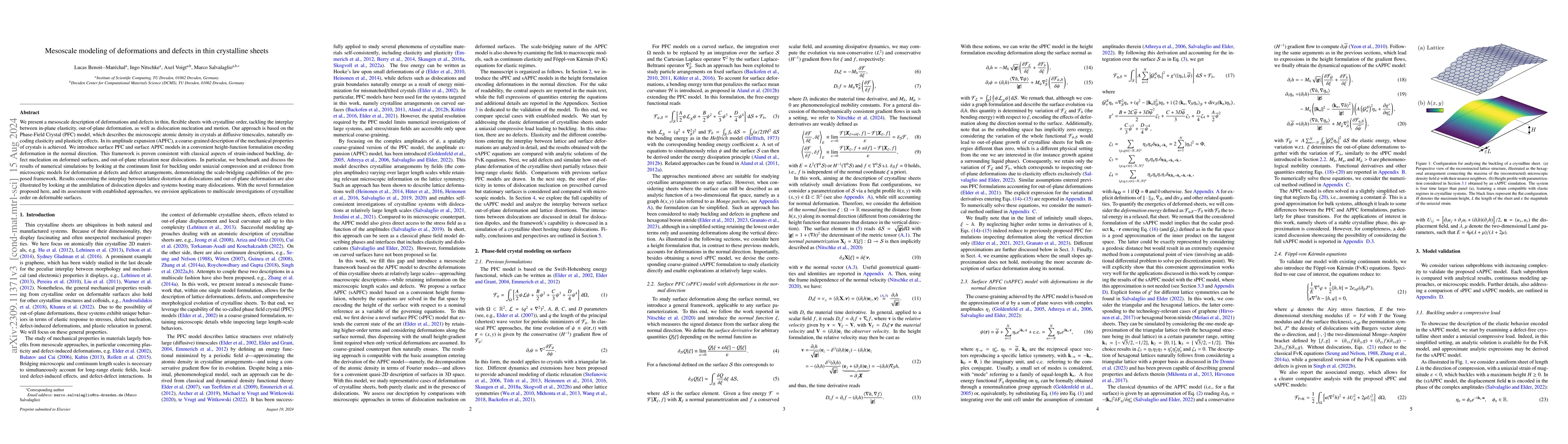 This paper presents a mesoscale model using the Phase-Field Crystal (PFC) framework to study deformations and defects in crystalline sheets, focusing on the interplay between elasticity, out-of-plane deformation, and dislocation behavior. The proposed surface PFC models effectively capture strain-induced buckling and defect nucleation, bridging continuum and microscopic scales.