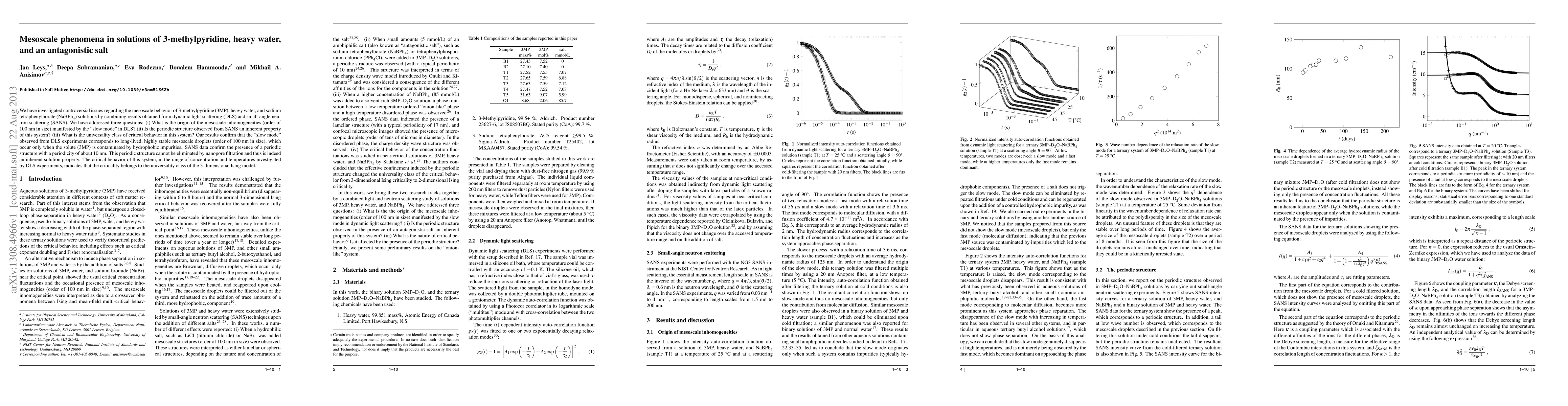 This study investigates the mesoscale behavior in solutions of 3-methylpyridine, heavy water, and sodium tetraphenylborate using DLS and SANS. The "slow mode" in DLS is attributed to stable mesoscale droplets caused by hydrophobic impurities in 3MP, while SANS reveals an inherent periodic structure of about 10 nm. The critical behavior is classified as the 3-dimensional Ising model.