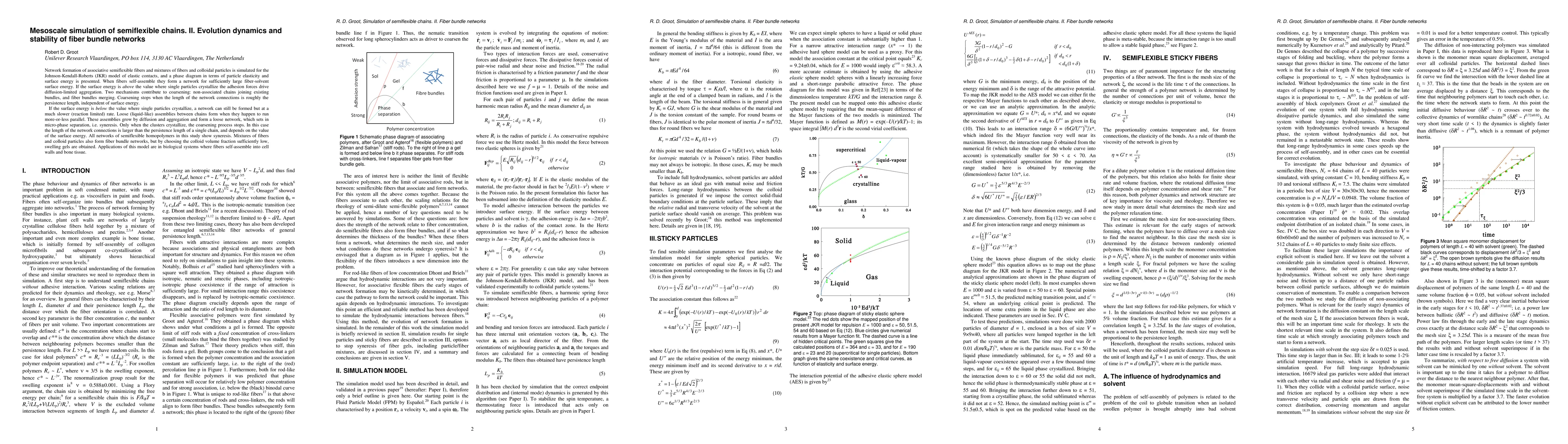 Network formation of associative semiflexible fibers and mixtures of fibers and colloidal particles is simulated for the Johnson-Kendall-Roberts (JKR) model of elastic contacts, and a phase diagram in terms of particle elasticity and surface energy is presented. When fibers self-assemble they form a network for sufficiently large fiber-solvent surface energy. If the surface energy is above the value where single particles crystallize the adhesion forces drive diffusion-limited aggregation. Two mechanisms contribute to coarsening: non-associated chains joining existing bundles, and fiber bundles merging. Coarsening stops when the length of the network connections is roughly the persistence length, independent of surface energy. If the surface energy is below the value where single particles crystallize, a network can still be formed but at a much slower (reaction limited) rate. Loose (liquid-like) assemblies between chains form when they happen to run more-or-less parallel. These assemblies grow by diffusion and aggregation and form a loose network, which sets in micro-phase separation, i.e. syneresis. Only when the clusters crystallize, the coarsening process stops. In this case the length of the network connections is larger than the persistence length of a single chain, and depends on the value of the surface energy. All networks of semiflexible homopolymers in this study show syneresis. Mixtures of fibers and colloid particles also form fiber bundle networks, but by choosing the colloid volume fraction sufficiently low, swelling gels are obtained. Applications of this model are in biological systems where fibers self-assemble into cell walls and bone tissue.