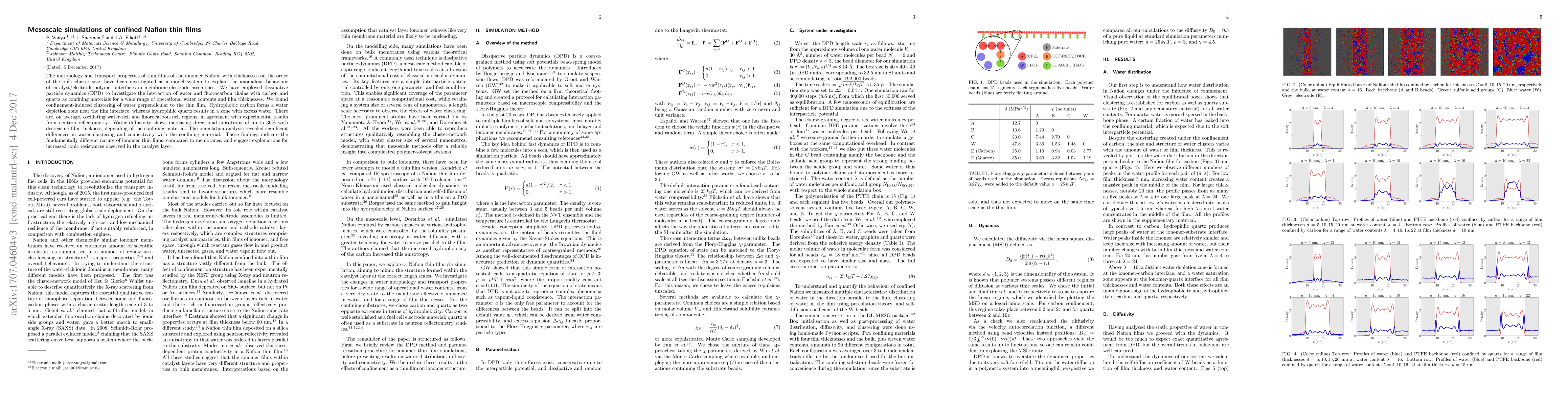 The use of DPD to investigate the interaction of water and fluorocarbon chains with confining materials provides new insights into the morphology and transport properties of ionomer thin films.