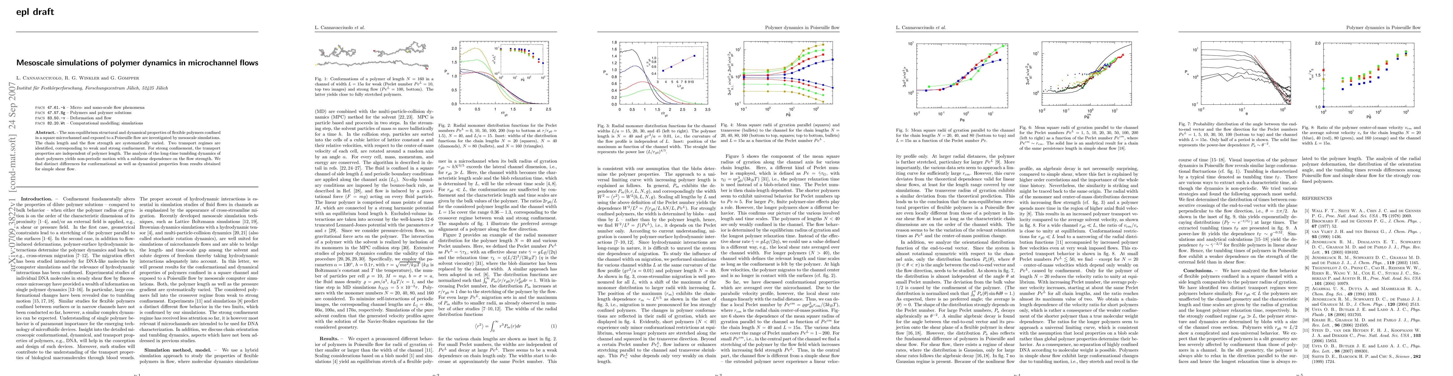 Mesoscale simulations reveal two distinct transport regimes in polymer dynamics within microchannel flows, showing independence from polymer length under strong confinement. Short polymer tumbling dynamics exhibit non-periodic motion with sublinear flow strength dependence, differing from simple shear flow results.