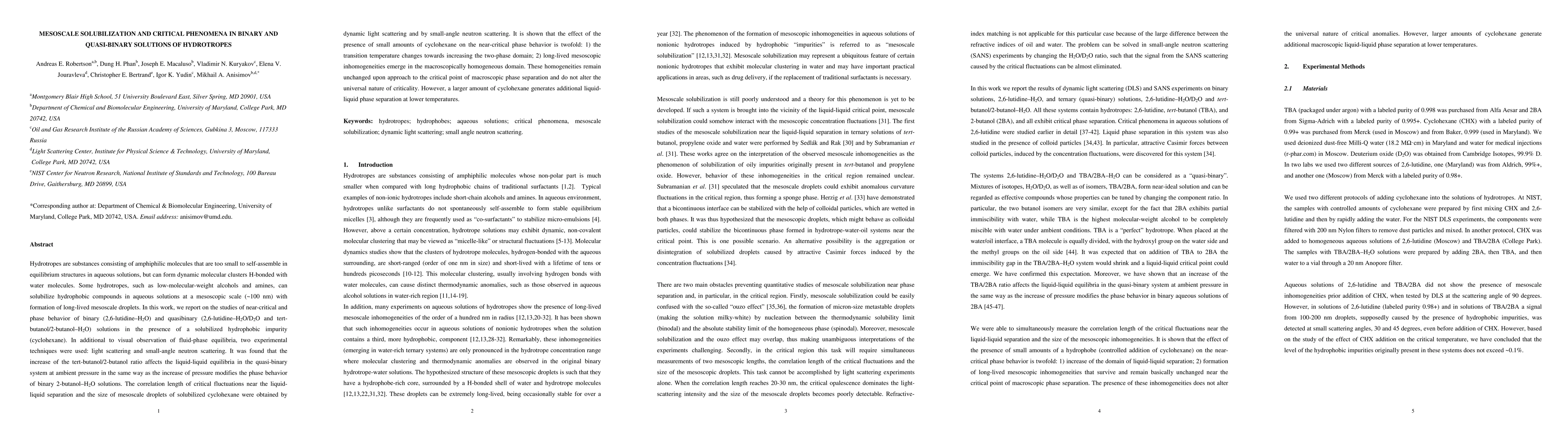 Hydrotropes are substances consisting of amphiphilic molecules that are too small to self assemble in equilibrium structures in aqueous solutions, but can form dynamic molecular clusters H bonded with water molecules. Some hydrotropes, such as low molecular weight alcohols and amines, can solubilize hydrophobic compounds in aqueous solutions at a mesoscopic scale, around 100 nm, with formation of long lived mesoscale droplets. In this work, we report on the studies of near critical and phase behavior of binary, 2,6-lutidine - H2O, and quasibinary, 2,6-lutidine - H2O - D2O, and tert-butanol - 2-butanol - H2O solutions in the presence of a solubilized hydrophobic impurity, cyclohexane. In additional to visual observation of fluid phase equilibria, two experimental techniques were used - light scattering and small - angle neutron scattering. It was found that the increase of the tert-butanol to 2-butanol ratio affects the liquid - liquid equilibria in the quasi-binary system at ambient pressure in the same way as the increase of pressure modifies the phase behavior of binary 2-butanol - H2O solutions. The correlation length of critical fluctuations near the liquid-liquid separation and the size of mesoscale droplets of solubilized cyclohexane were obtained by dynamic light scattering and by small - angle neutron scattering. It is shown that the effect of the presence of small amounts of cyclohexane on the near - critical phase behavior is twofold - the transition temperature changes towards increasing the two-phase domain, and long-lived mesoscopic inhomogeneities emerge in the macroscopically homogeneous domain. These homogeneities remain unchanged upon approach to the critical point of macroscopic phase separation and do not alter the universal nature of criticality. However, a larger amount of cyclohexane generates additional liquid-liquid phase separation at lower temperatures.