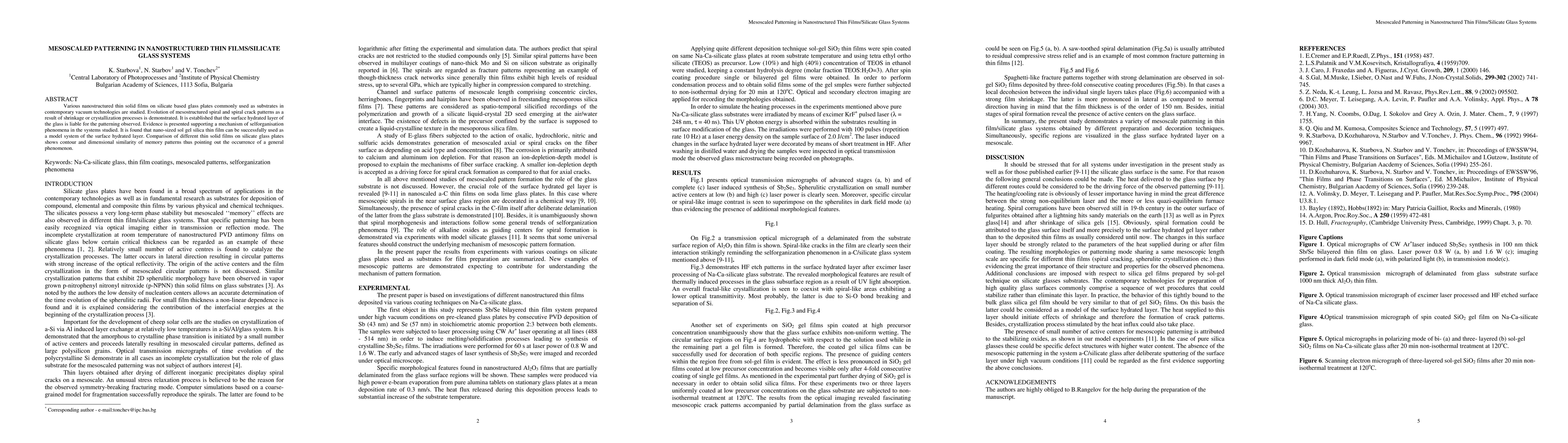 Various nanostructured thin solid films on silicate based glass plates commonly used as substrates in contemporary vacuum technologies are studied. Evolution of mesostructured spiral and spiral crack patterns as a result of shrinkage or crystalliz4 tion processes is demonstrated. It is established that the surface hydrated layer of the glass is liable for the patterning observed. Evidence is presented supporting a mechanism of selforganization phenomena in the systems studied. It is found that nano-sized sol gel silica thin film can be successfully used as a model system of the surface hydrated layer. Comparison of different thin solid films on silicate glass plates shows contour and dimensional similarity of memory patterns thus pointing out the occurrence of a general phenomenon.