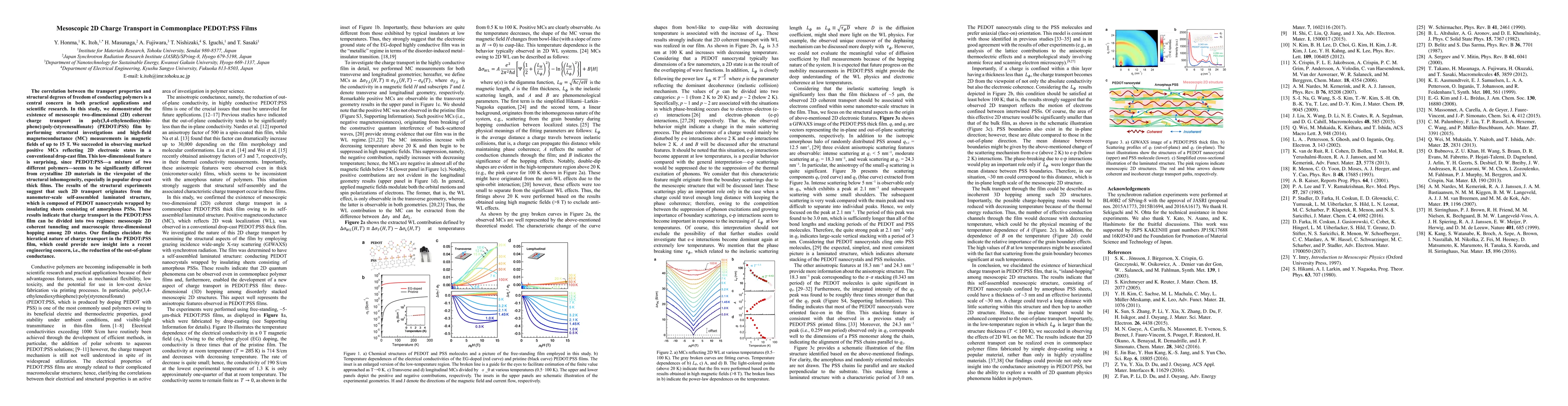 This study reveals mesoscopic two-dimensional coherent charge transport in PEDOT:PSS films, observed through high-field magnetoconductance measurements. The findings suggest that this low-dimensional transport arises from a nanometer-scale laminated structure, leading to two distinct charge transport regimes: mesoscopic 2D tunneling and macroscopic 3D hopping.