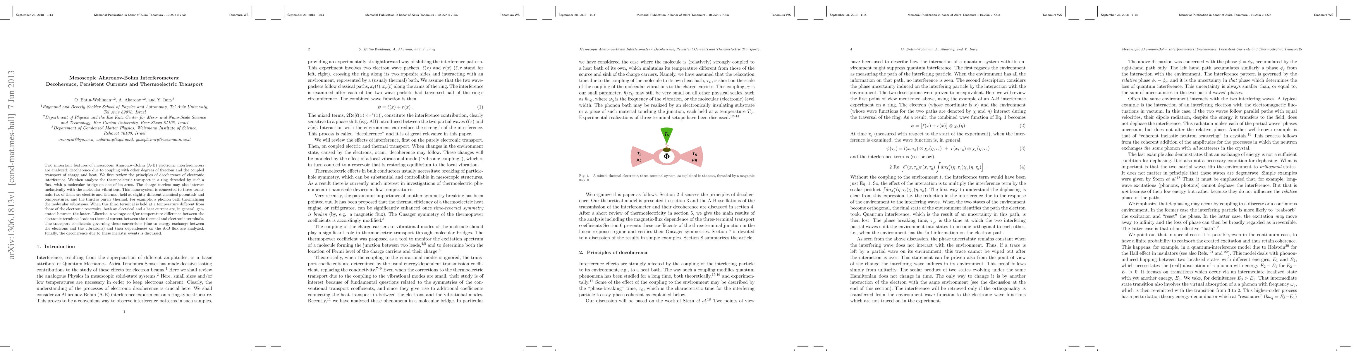 This paper investigates decoherence in mesoscopic Aharonov-Bohm interferometers and analyzes thermoelectric transport in such systems. It examines how electronic interference decoheres due to interactions with other degrees of freedom and explores coupled charge and heat transport in a ring with a molecular bridge, focusing on the effects of inelastic electron-vibration interactions.
