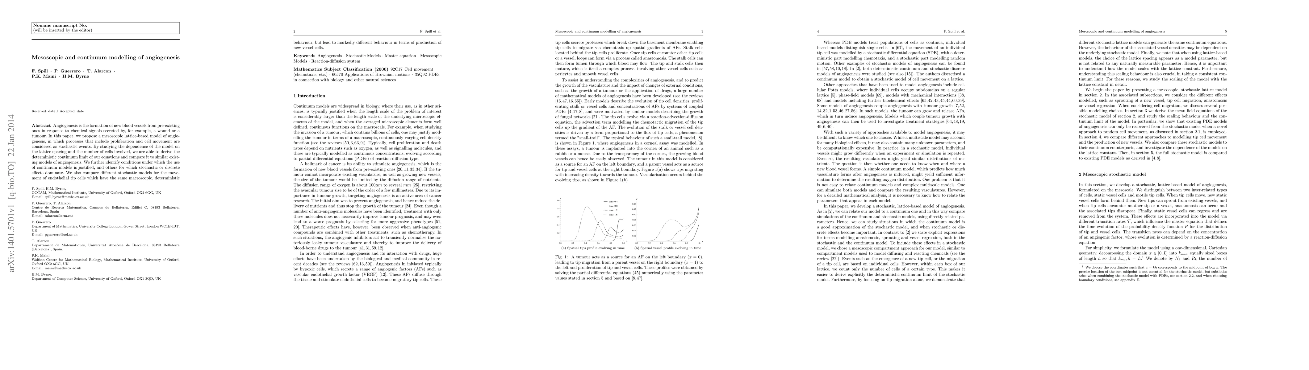 This paper proposes a mesoscopic model of angiogenesis that considers stochastic events in cell proliferation and movement, and derives a continuum limit for comparison with existing models. It highlights conditions under which discrete effects dominate over continuous models.