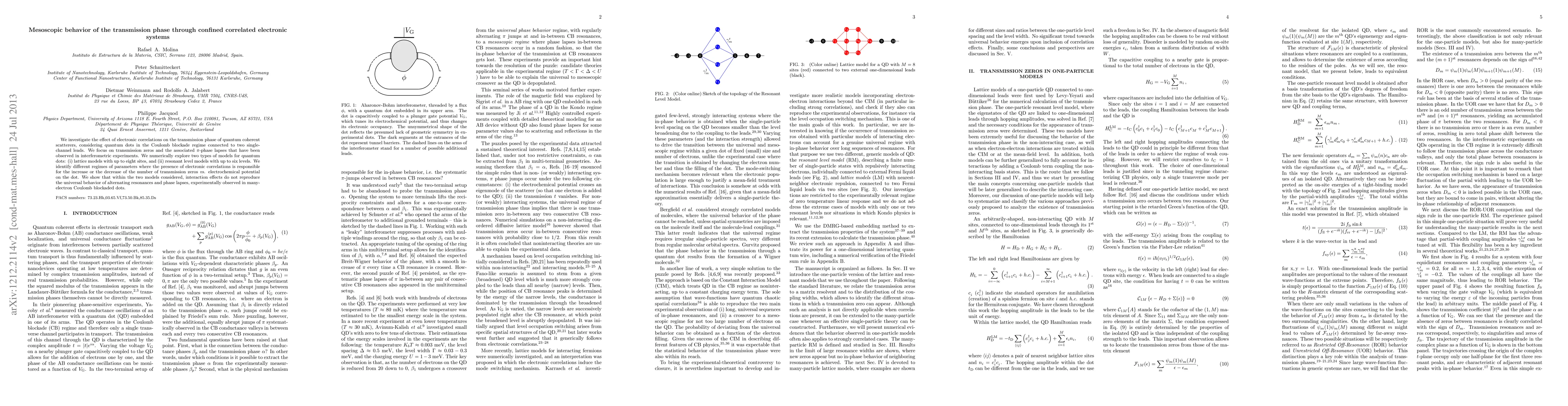 This paper investigates the impact of electronic correlations on the transmission phase in quantum coherent scatterers, particularly focusing on quantum dots in the Coulomb blockade regime. The study finds that while correlations can affect the number of transmission zeros, they cannot fully explain the universal behavior of alternating resonances and phase lapses observed experimentally, suggesting that one-particle wave-function correlations are more significant than many-particle correlations.