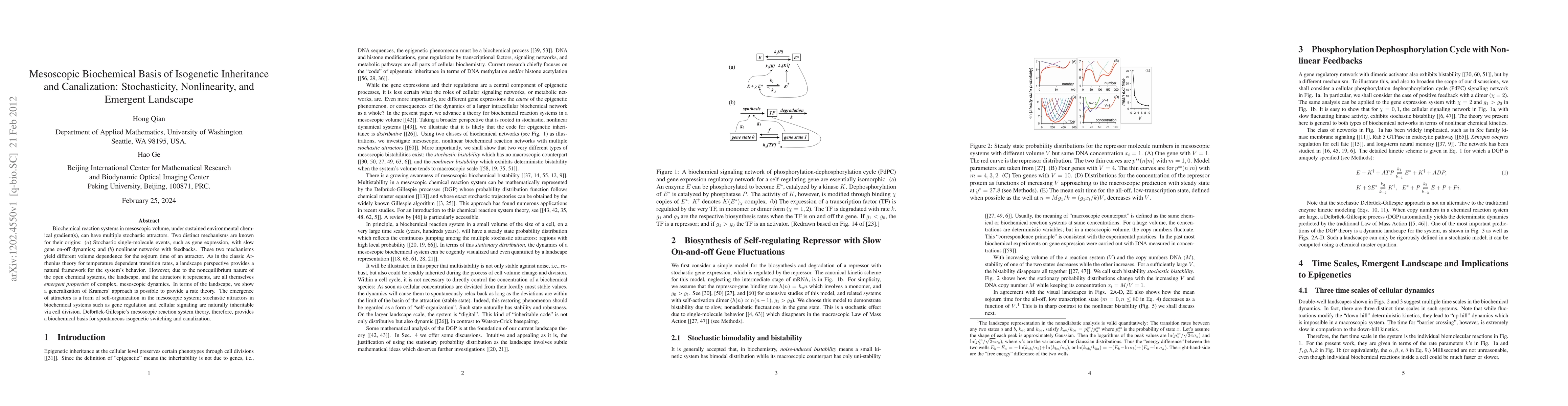Biochemical reaction systems in mesoscopic volume, under sustained environmental chemical gradient(s), can have multiple stochastic attractors. Two distinct mechanisms are known for their origins: ($a$) Stochastic single-molecule events, such as gene expression, with slow gene on-off dynamics; and ($b$) nonlinear networks with feedbacks. These two mechanisms yield different volume dependence for the sojourn time of an attractor. As in the classic Arrhenius theory for temperature dependent transition rates, a landscape perspective provides a natural framework for the system's behavior. However, due to the nonequilibrium nature of the open chemical systems, the landscape, and the attractors it represents, are all themselves {\em emergent properties} of complex, mesoscopic dynamics. In terms of the landscape, we show a generalization of Kramers' approach is possible to provide a rate theory. The emergence of attractors is a form of self-organization in the mesoscopic system; stochastic attractors in biochemical systems such as gene regulation and cellular signaling are naturally inheritable via cell division. Delbr\"{u}ck-Gillespie's mesoscopic reaction system theory, therefore, provides a biochemical basis for spontaneous isogenetic switching and canalization.