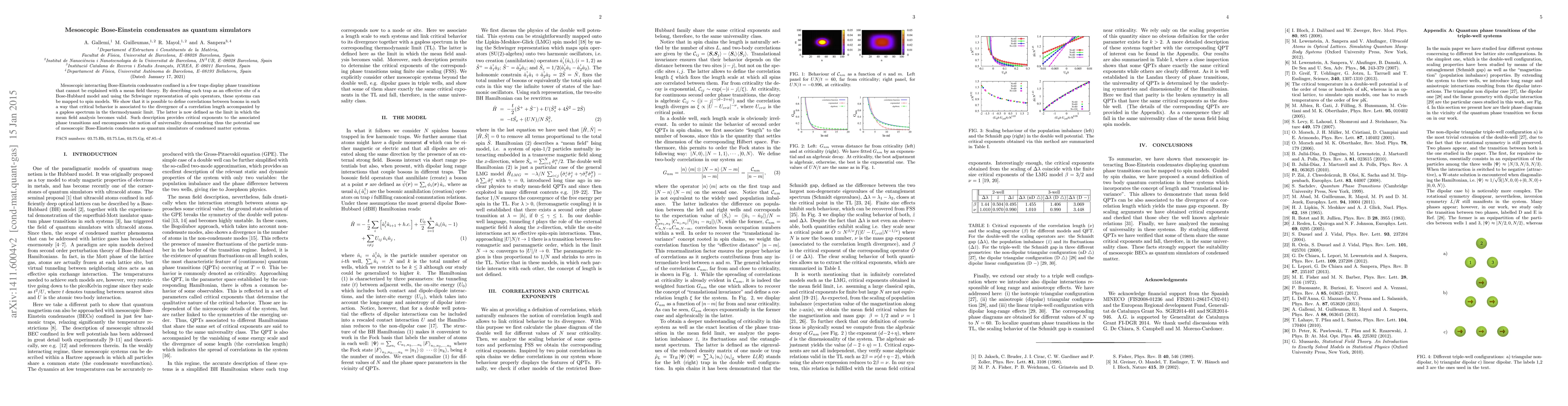 Mesoscopic interacting Bose-Einstein condensates exhibit phase transitions beyond mean field theory, which can be mapped to spin models using a Bose-Hubbard model and Schwinger representation. The critical behavior is characterized by a diverging correlation length and a gapless spectrum, establishing these condensates as quantum simulators for condensed matter systems.