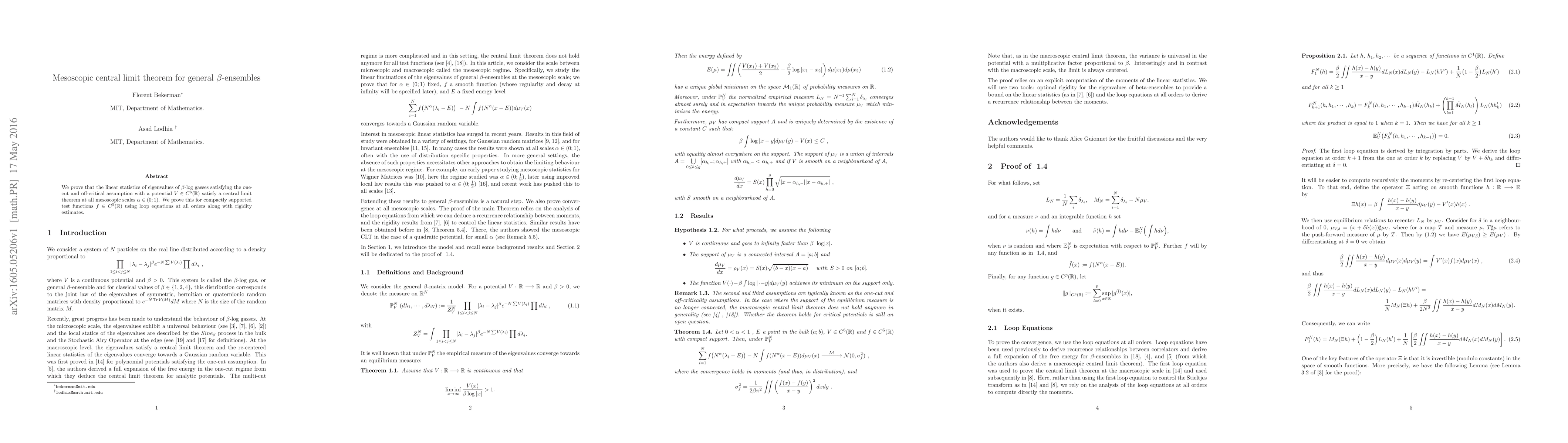 Summary: The paper proves a mesoscopic central limit theorem for linear statistics of eigenvalues in $\beta$-log gas ensembles under specific conditions, utilizing loop equations and rigidity estimates to achieve the result for compactly supported test functions.