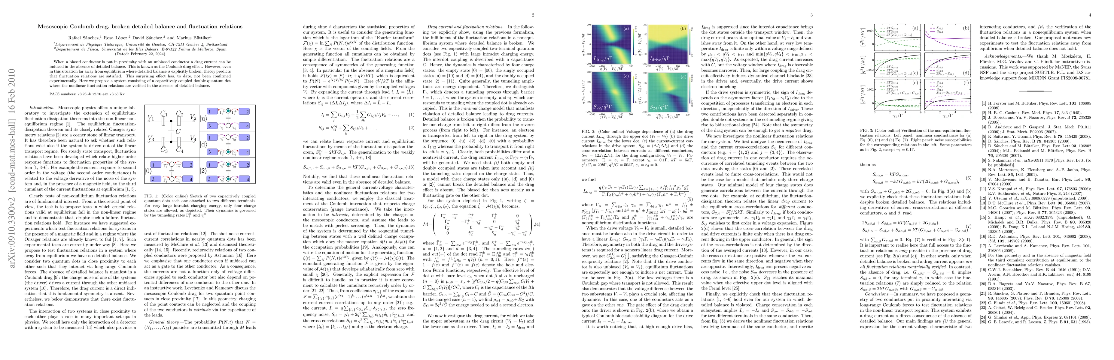 This paper investigates the Coulomb drag effect in capacitively coupled double quantum dots, demonstrating that fluctuation relations hold even when detailed balance is broken. The authors propose a system where these nonlinear relations are experimentally verifiable.