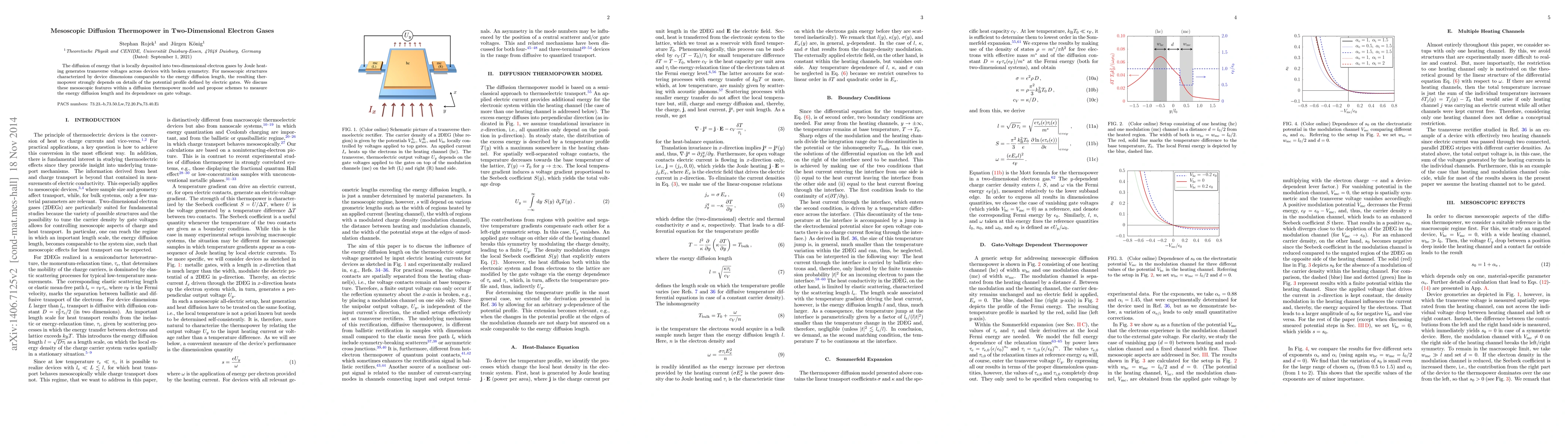 The diffusion of energy that is locally deposited into two-dimensional electron gases by Joule heating generates transverse voltages across devices with broken symmetry. For mesoscopic structures characterized by device dimensions comparable to the energy diffusion length, the resulting thermopower strongly depends on details of the potential profile defined by electric gates. We discuss these mesoscopic features within a diffusion thermopower model and propose schemes to measure the energy diffusion length and its dependence on gate voltage.