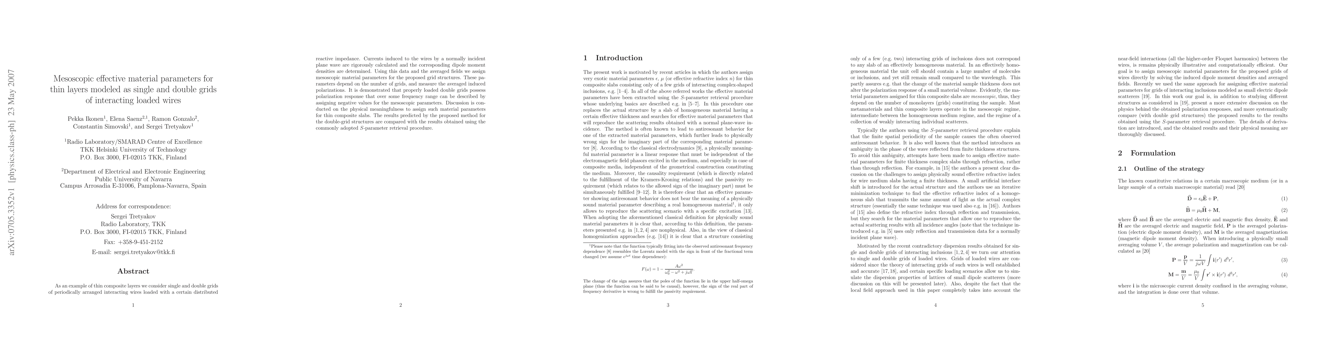 This paper investigates mesoscopic effective material parameters for thin composite layers modeled as single and double grids of periodically arranged interacting wires. The study calculates induced currents and dipole moment densities for these grids under plane wave incidence, determining material parameters that reflect averaged induced polarizations, which can be negative for properly loaded double grids.