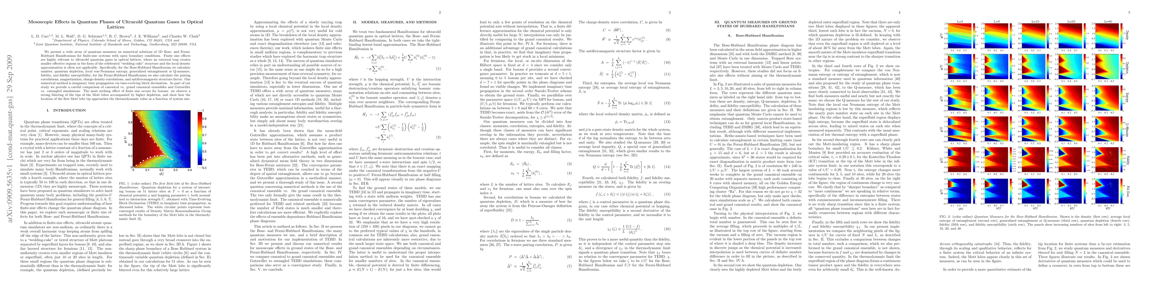 This paper investigates mesoscopic effects in quantum phases of ultracold gases in optical lattices using numerical solutions of 1D Bose- and Fermi-Hubbard models. The study highlights finite size effects, including quantum depletion, entanglement measures, and correlations, revealing significant differences between canonical and grand canonical ensembles and the impact of system size on the first Mott lobe tip.