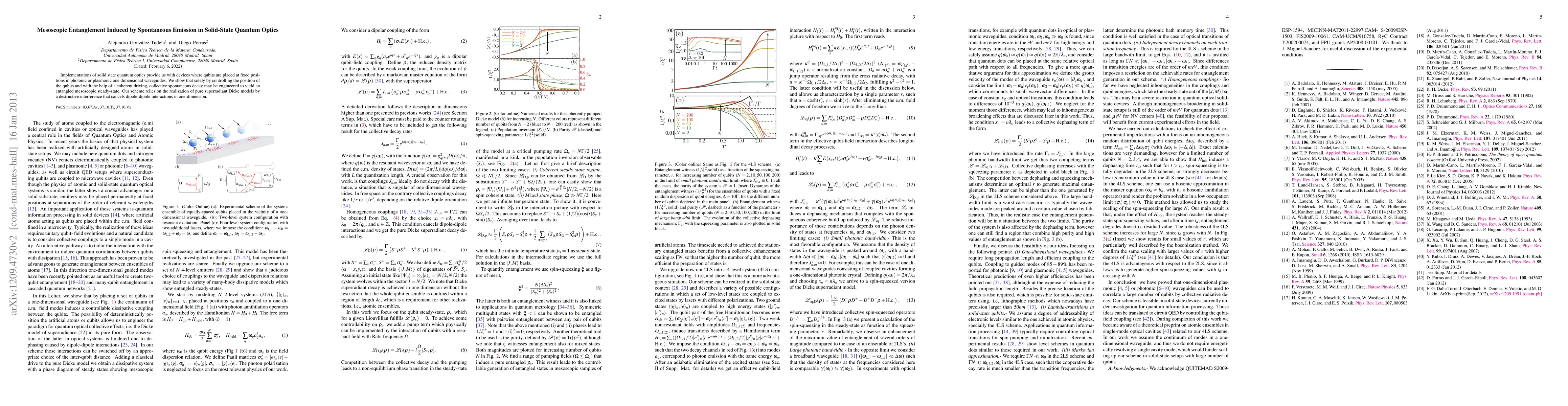 This paper demonstrates how controlling qubit positions and using coherent driving can induce mesoscopic entanglement through collective spontaneous decay in solid-state quantum optics, achieving pure superradiant Dicke models via destructive interference.