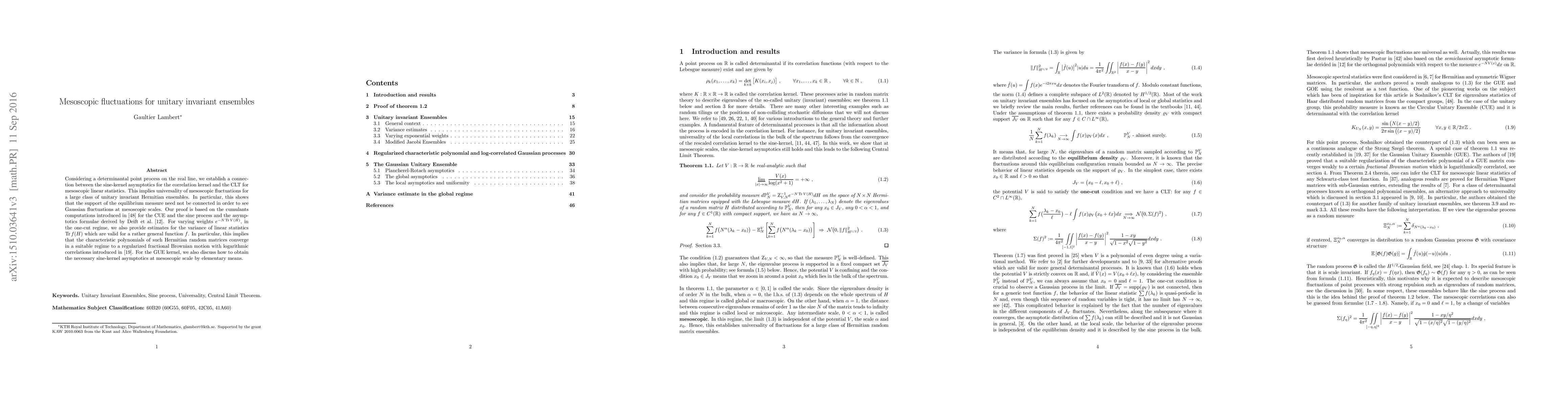 This paper establishes a connection between the sine-kernel asymptotics and the Central Limit Theorem for mesoscopic linear statistics in unitary invariant ensembles, demonstrating universality in mesoscopic fluctuations. It also shows that Gaussian fluctuations can occur even when the support of the equilibrium measure is not connected.