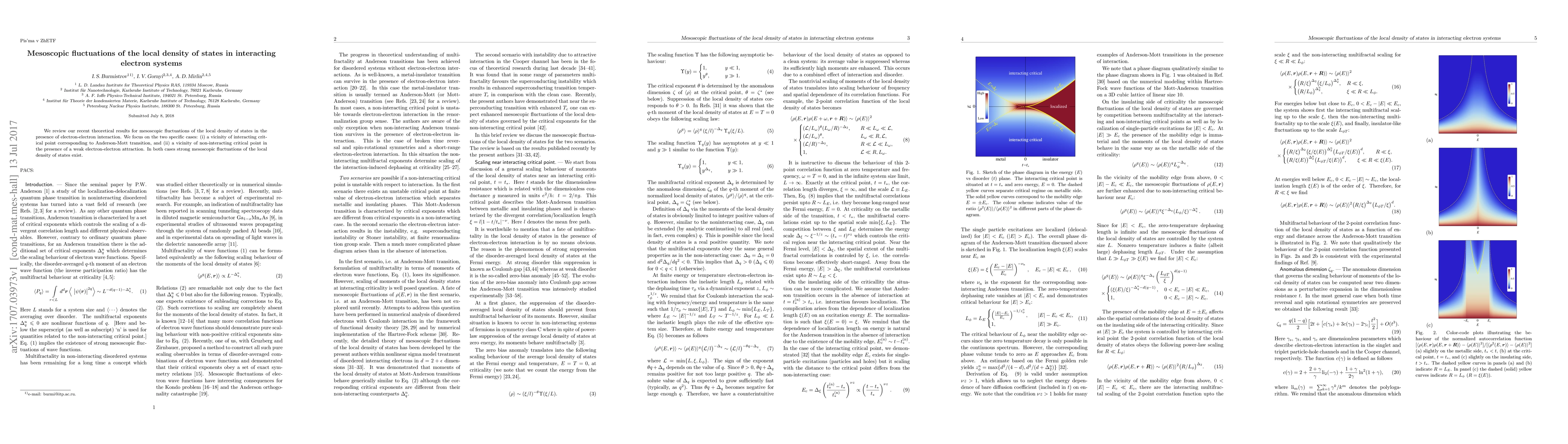 This paper reviews theoretical findings on mesoscopic fluctuations in the local density of states in interacting electron systems, particularly near critical points for Anderson-Mott transition and weak electron-electron attraction, highlighting significant fluctuations in both scenarios.
