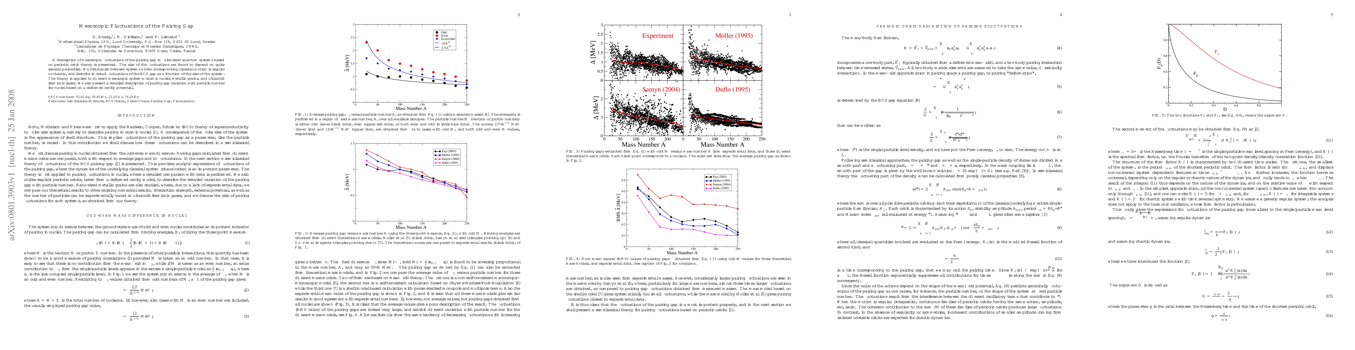 This paper explores mesoscopic fluctuations of the pairing gap in finite quantum systems, using periodic orbit theory to analyze how these fluctuations vary with system size and classical motion characteristics. It applies the theory to atomic nuclei, metallic grains, and ultracold fermionic gases, and provides a detailed analysis of BCS gap variations with particle number in nuclei.
