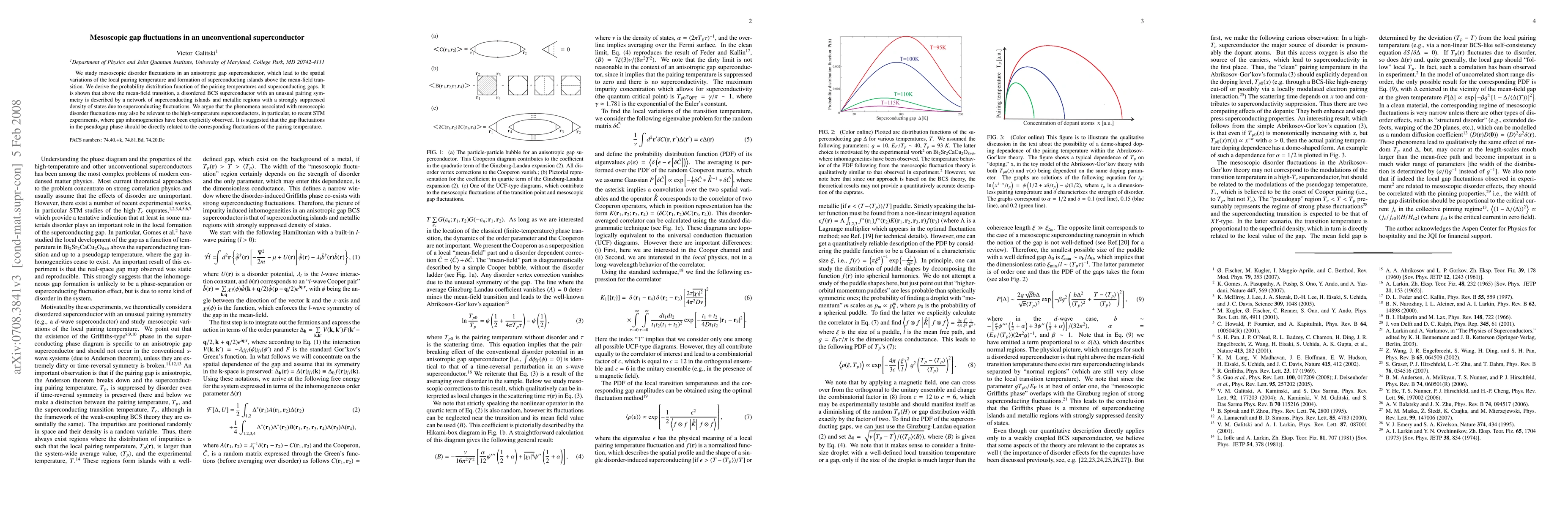 Researchers study fluctuations in an unconventional superconductor, finding that mesoscopic disorder leads to spatial variations of pairing temperature and formation of superconducting islands. These findings may be relevant to high-temperature superconductors and explain recent STM observations of gap inhomogeneities.