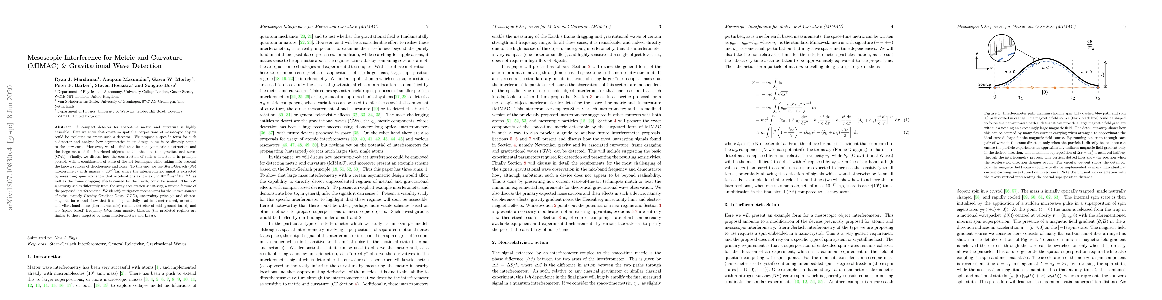 A compact detector for space-time metric and curvature is highly desirable. Here we show that quantum spatial superpositions of mesoscopic objects, of the type which would in principle become possible with a combination of state of the art techniques and taking into account the known sources of decoherence, could be exploited to create such a detector. By using Stern-Gerlach (SG) interferometry with masses much larger than atoms, where the interferometric signal is extracted by measuring spins, we show that accelerations as low as $5\times10^{-15}\textrm{ms}^{-2}\textrm{Hz}^{-1/2}$ or better, as well as the frame dragging effects caused by the Earth, could be sensed. Constructing such an apparatus to be non-symmetric would also enable the direct detection of curvature and gravitational waves (GWs). The GW sensitivity scales differently from the stray acceleration sensitivity, a unique feature of MIMAC. We have identified mitigation mechanisms for the known sources of noise, namely Gravity Gradient Noise (GGN), uncertainty principle and electro-magnetic forces. Hence it could potentially lead to a meter sized, orientable and vibrational noise (thermal/seismic) resilient detector of mid (ground based) and low (space based) frequency GWs from massive binaries (the predicted regimes are similar to those targeted by atom interferometers and LISA).
