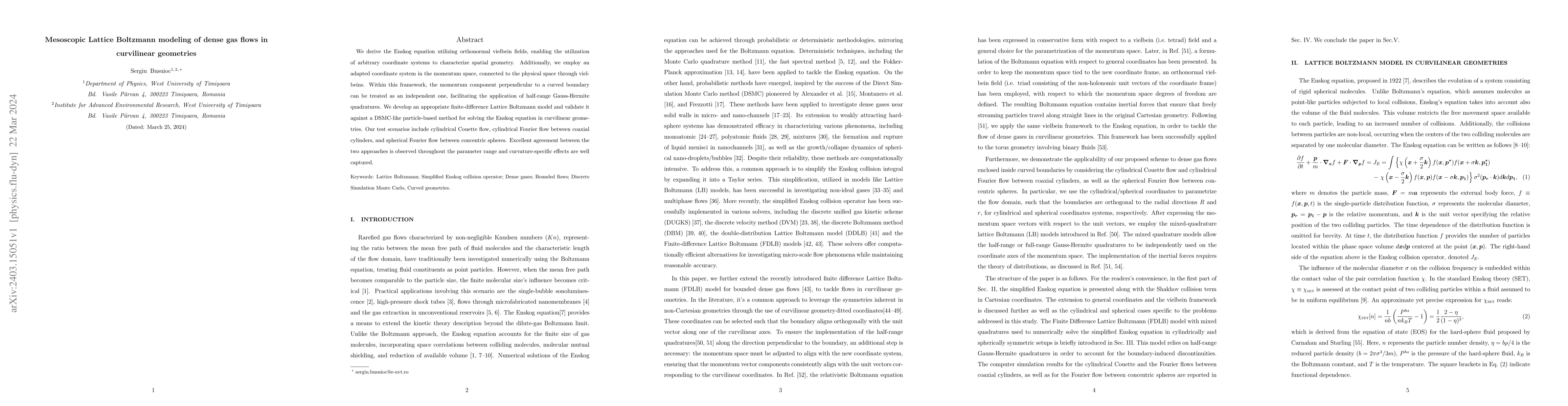 We derive the Enskog equation utilizing orthonormal vielbein fields, enabling the utilization of arbitrary coordinate systems to characterize spatial geometry. Additionally, we employ an adapted coordinate system in the momentum space, connected to the physical space through vielbeins. Within this framework, the momentum component perpendicular to a curved boundary can be treated as an independent one, facilitating the application of half-range Gauss-Hermite quadratures. We develop an appropriate finite-difference Lattice Boltzmann model and validate it against a DSMC-like particle-based method for solving the Enskog equation in curvilinear geometries. Our test scenarios include cylindrical Couette flow, cylindrical Fourier flow between coaxial cylinders, and spherical Fourier flow between concentric spheres. Excellent agreement between the two approaches is observed throughout the parameter range and curvature-specific effects are well captured.