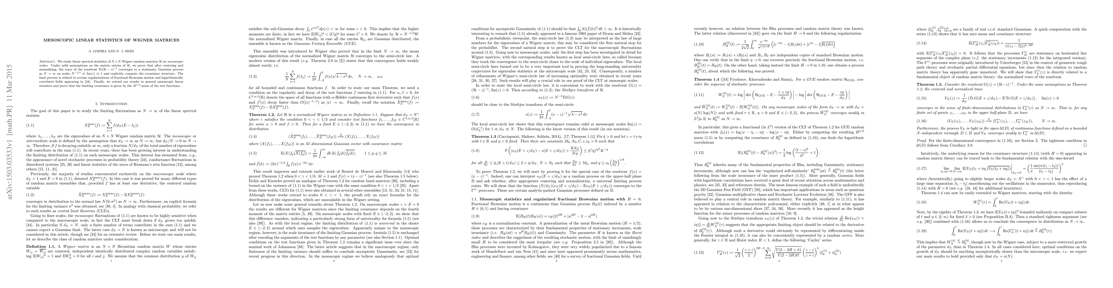 The paper presents a detailed proof of the convergence of linear spectral statistics for Wigner matrices on mesoscopic scales, introducing a novel approach to compute the covariance structure of the limiting Gaussian process.