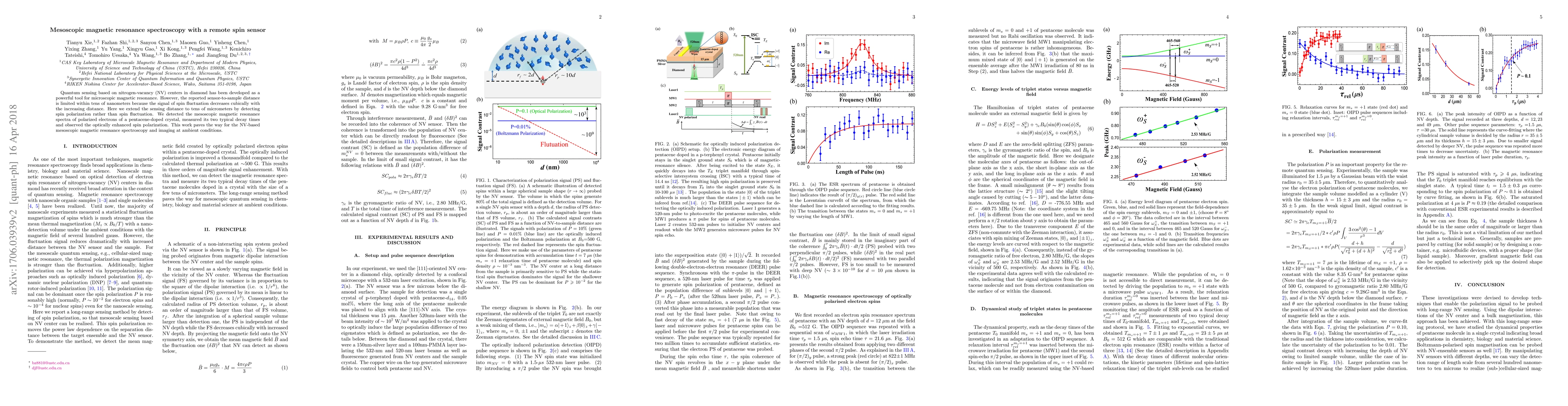 This paper extends the sensing distance of quantum NV center-based magnetic resonance spectroscopy to tens of micrometers by detecting spin polarization instead of spin fluctuation, enabling mesoscopic magnetic resonance spectroscopy of a pentacene-doped crystal. This advancement facilitates NV-based imaging and spectroscopy at ambient conditions.