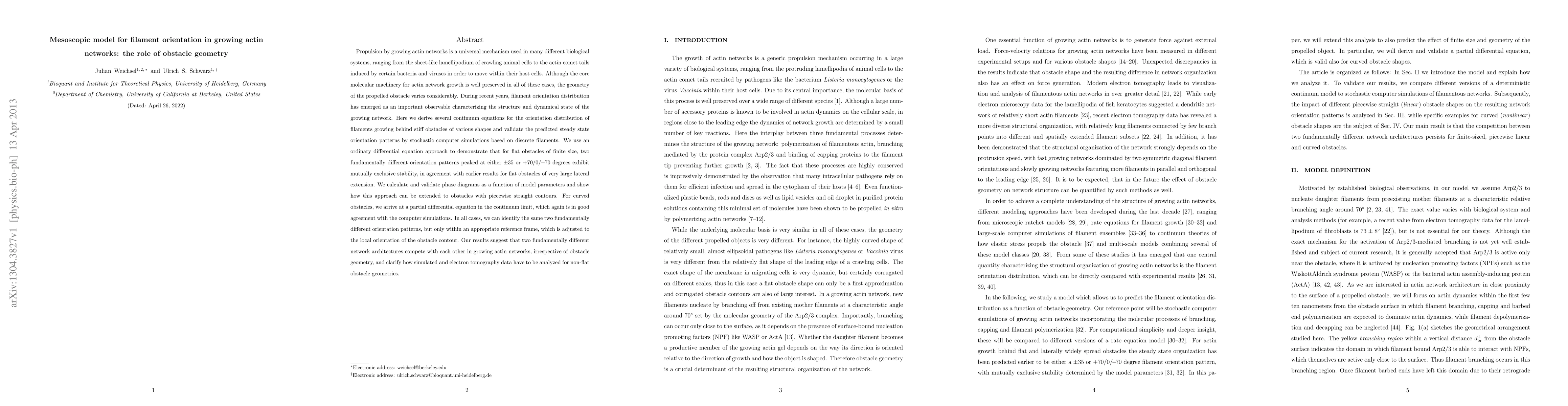 This paper develops continuum models to describe the orientation distribution of actin filaments in growing networks behind various obstacle geometries, showing two distinct orientation patterns. The study validates these models through simulations and identifies the influence of obstacle shape on filament orientation, providing insights into actin network dynamics.