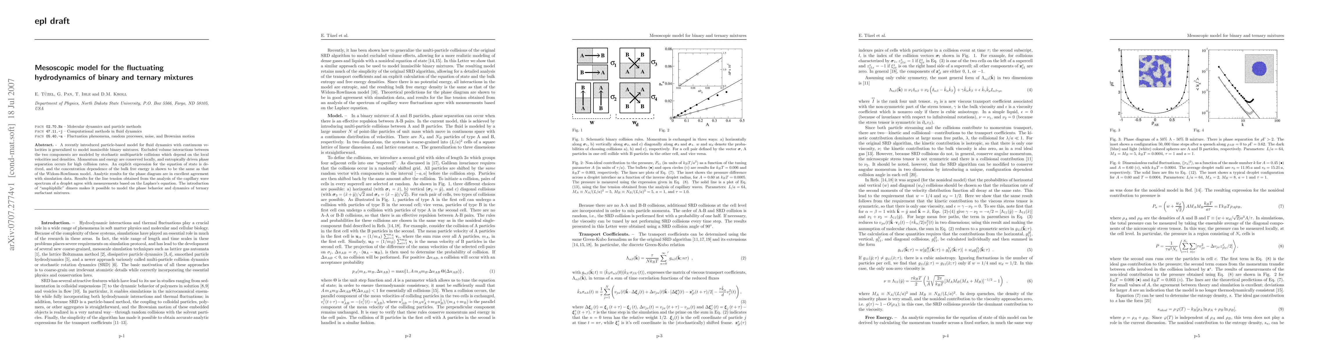 A new model for fluid dynamics of binary mixtures shows that excluded volume interactions can lead to phase separation, with the concentration dependence matching a known model. The model also successfully predicts the behavior of ternary surfactant mixtures.