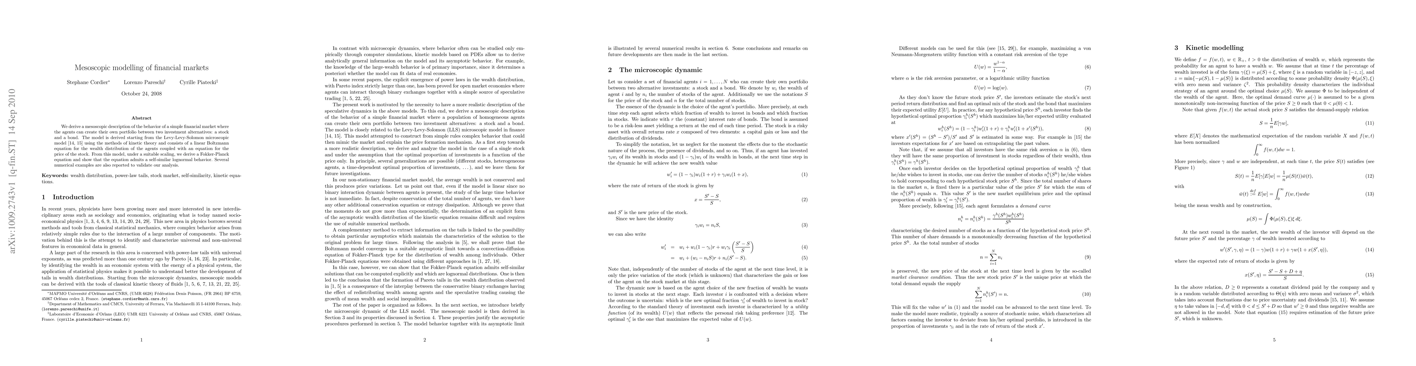 This research paper presents a mesoscopic model of financial markets, derived from the Levy-Levy-Solomon microscopic model using kinetic theory. It introduces a linear Boltzmann equation for wealth distribution and an equation for stock price, scaling to a Fokker-Planck equation. The study reveals a self-similar lognormal behavior in the market, supported by numerical examples.