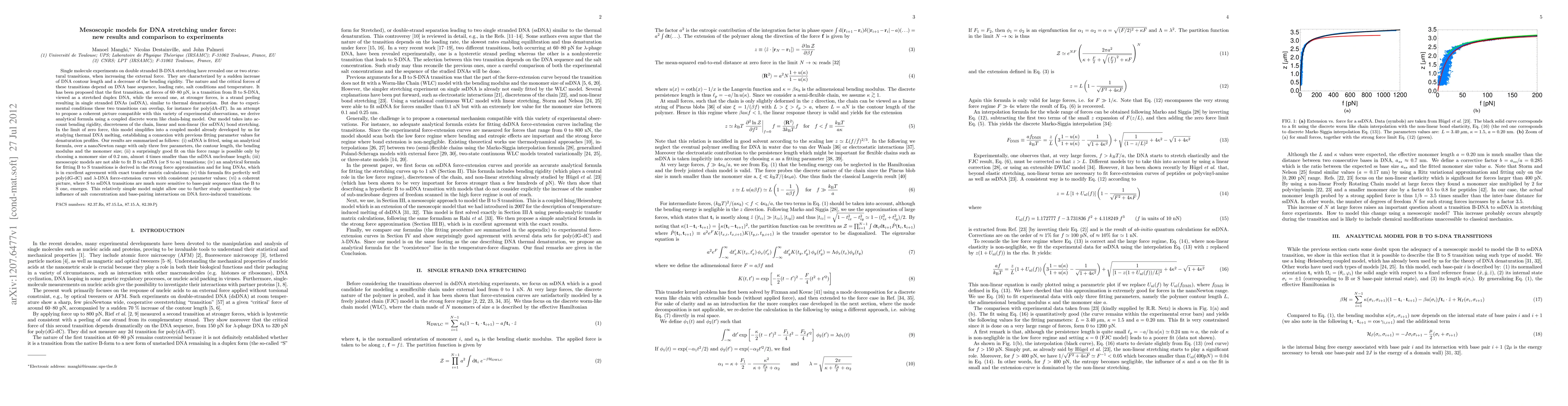This paper develops a mesoscopic model to analyze DNA stretching under force, showing that single-stranded DNA can be accurately fitted using an analytical formula with three parameters. The model reveals that B to S-DNA transitions align well with experimental data, while B to ssDNA transitions are not well captured, highlighting sequence sensitivity in S to ssDNA transitions.