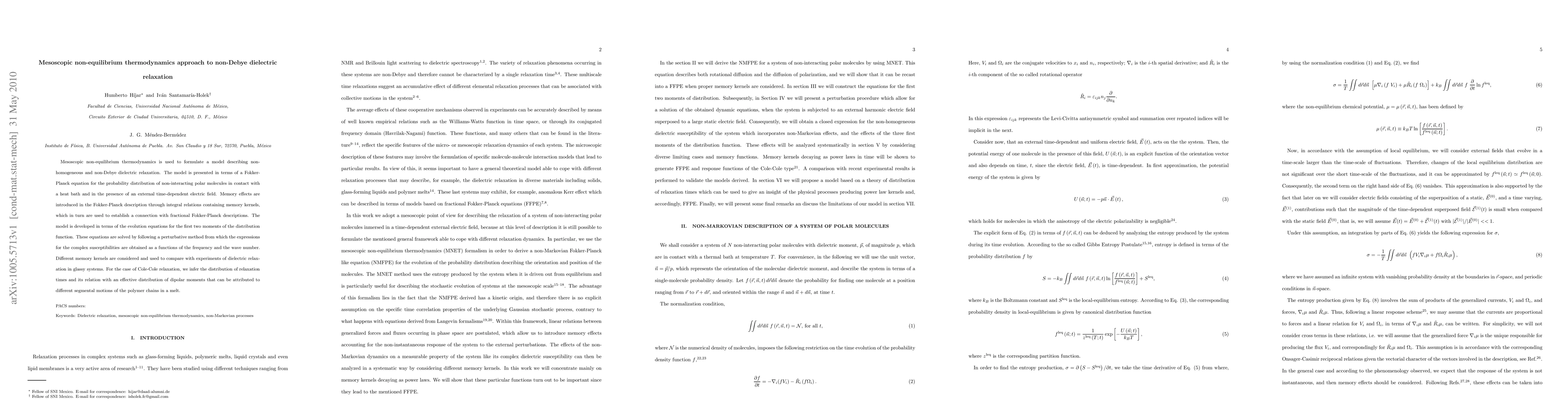 This paper develops a mesoscopic non-equilibrium thermodynamics model for non-Debye dielectric relaxation using a Fokker-Planck equation, incorporating memory effects via integral relations. The model's predictions are compared with experimental data on glassy systems, revealing insights into the distribution of relaxation times linked to polymer segmental motions.