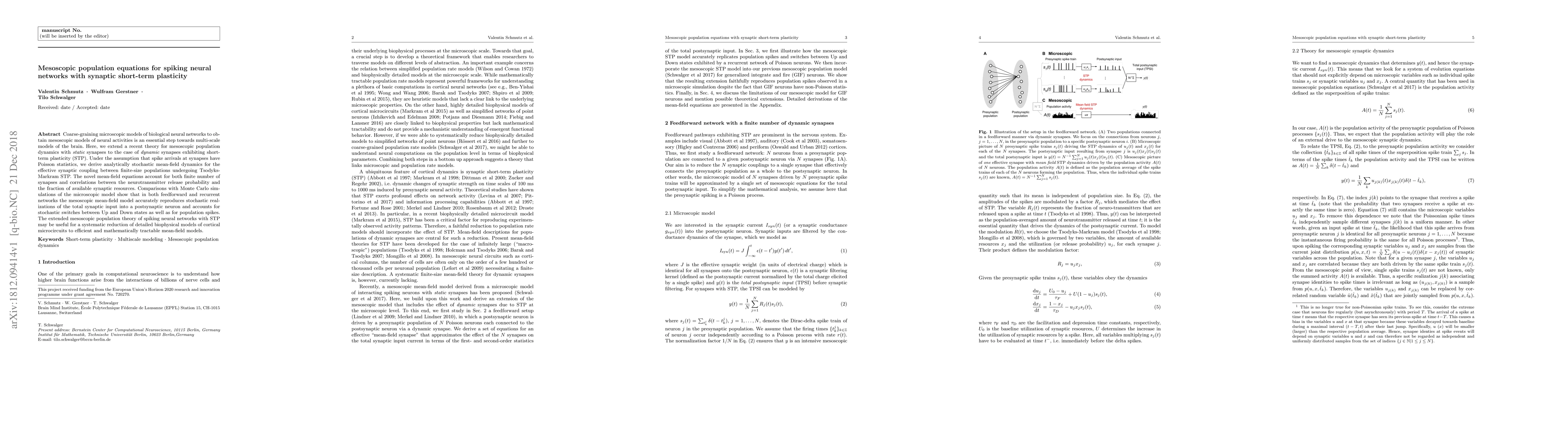 The paper presents mesoscopic population equations for spiking neural networks with STP, extending a previous theory for static synapses to dynamic ones, and derives stochastic differential equations for key STP variables.