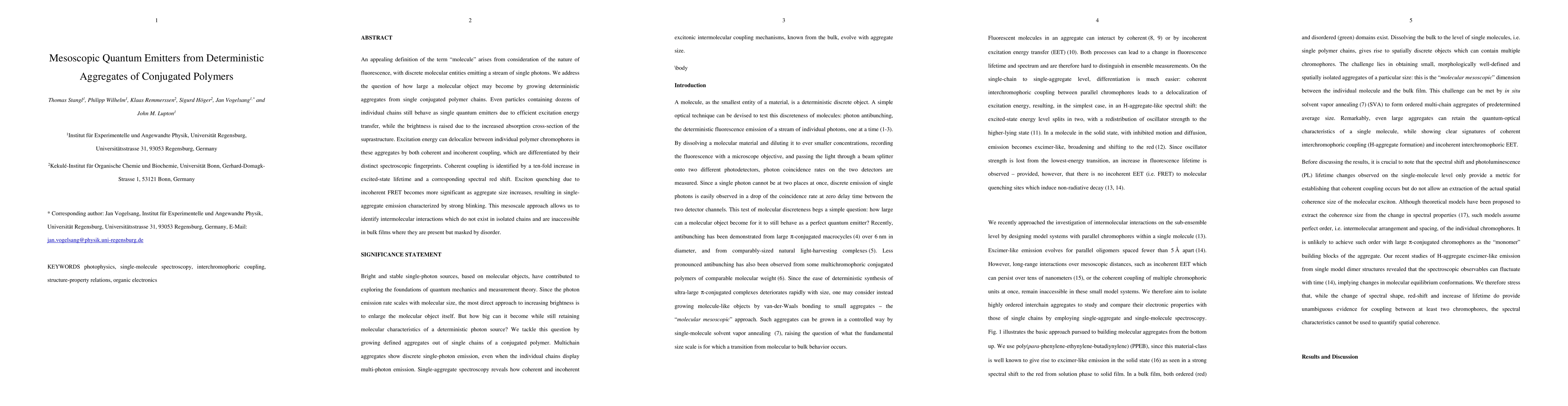 An appealing definition of the term "molecule" arises from consideration of the nature of fluorescence, with discrete molecular entities emitting a stream of single photons. We address the question of how large a molecular object may become by growing deterministic aggregates from single conjugated polymer chains. Even particles containing dozens of individual chains still behave as single quantum emitters due to efficient excitation energy transfer, while the brightness is raised due to the increased absorption cross-section of the suprastructure. Excitation energy can delocalize between individual polymer chromophores in these aggregates by both coherent and incoherent coupling, which are differentiated by their distinct spectroscopic fingerprints. Coherent coupling is identified by a ten-fold increase in excited-state lifetime and a corresponding spectral red shift. Exciton quenching due to incoherent FRET becomes more significant as aggregate size increases, resulting in single-aggregate emission characterized by strong blinking. This mesoscale approach allows us to identify intermolecular interactions which do not exist in isolated chains and are inaccessible in bulk films where they are present but masked by disorder.