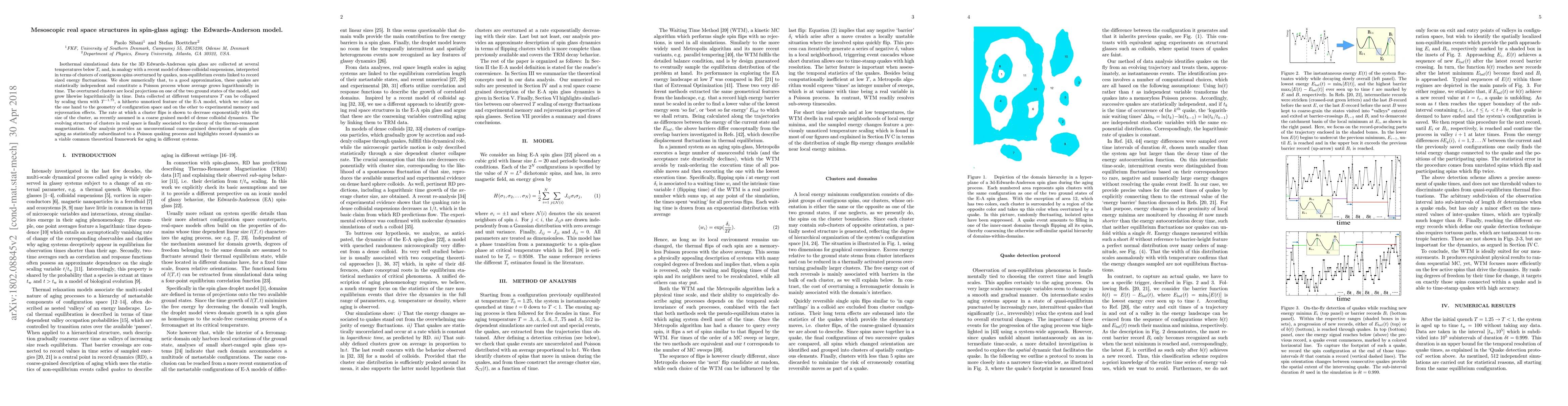This paper investigates the mesoscopic real space structures in the 3D Edwards-Anderson spin glass model, showing that quakes and overturned spin clusters follow a Poisson process with logarithmic growth in time. It reveals a scaling relationship for temperature-dependent data and connects cluster dynamics to the thermo-remanent magnetization decay.