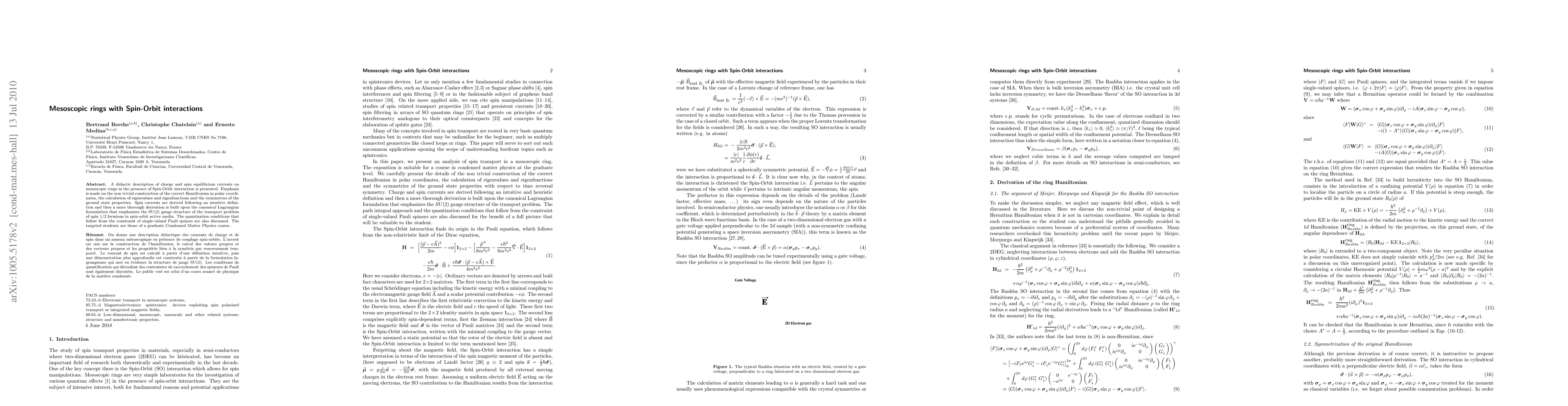A didactic description of charge and spin equilibrium currents on mesoscopic rings in the presence of Spin-Orbit interaction is presented. Emphasis is made on the non trivial construction of the correct Hamiltonian in polar coordinates, the calculation of eigenvalues and eigenfunctions and the symmetries of the ground state properties. Spin currents are derived following an intuitive definition and then a more thorough derivation is built upon the canonical Lagrangian formulation that emphasizes the SU(2) gauge structure of the transport problem of spin 1/2 fermions in spin-orbit active media. The quantization conditions that follow from the constraint of single-valued Pauli spinors are also discussed. The targeted students are those of a graduate Condensed Matter Physics course.