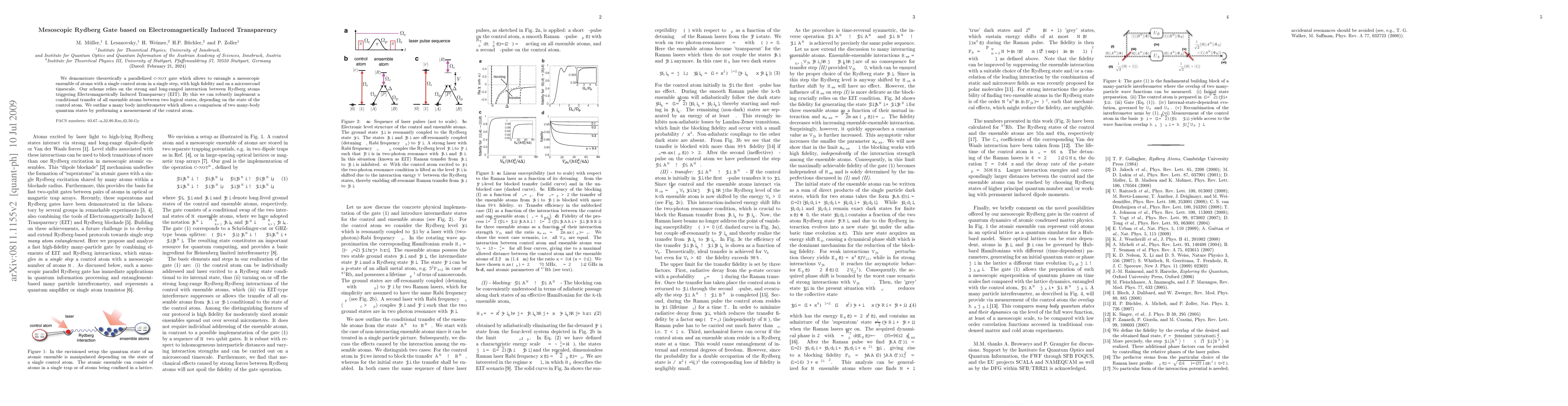 This paper proposes a high-fidelity, parallelized C-NOT gate for entangling a mesoscopic ensemble of Rydberg atoms with a single control atom, utilizing Electromagnetically Induced Transparency (EIT) for robust conditional state transfer. The scheme operates on a microsecond timescale and includes a many-body interferometer for state comparison.