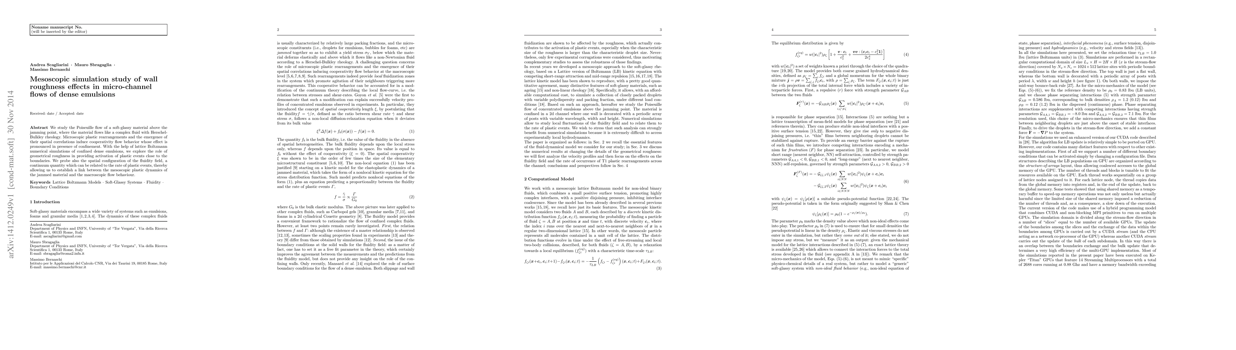 This paper uses lattice Boltzmann simulations to study the Poiseuille flow of dense emulsions in micro-channels, focusing on the effects of wall roughness on plastic rearrangements and flow behavior. The research establishes a link between mesoscopic plastic dynamics and macroscopic flow characteristics.