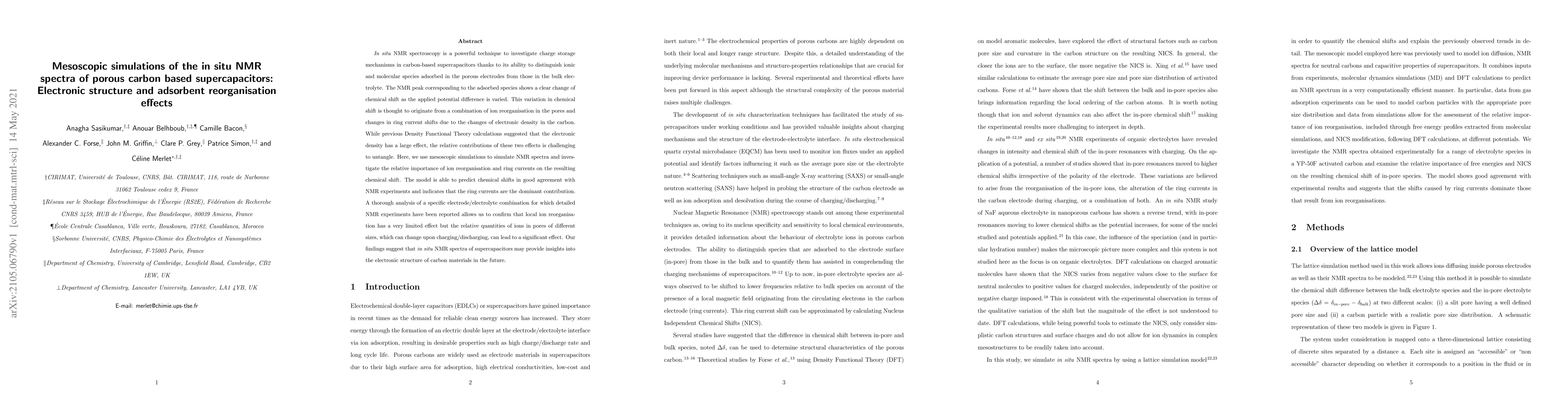 This paper uses mesoscopic simulations to analyze in situ NMR spectra of porous carbon supercapacitors, revealing that ring currents due to electronic density changes in carbon dominate the chemical shift variation, while ion reorganisation has a limited effect. The study suggests that NMR spectra can offer insights into the electronic structure of carbon materials.