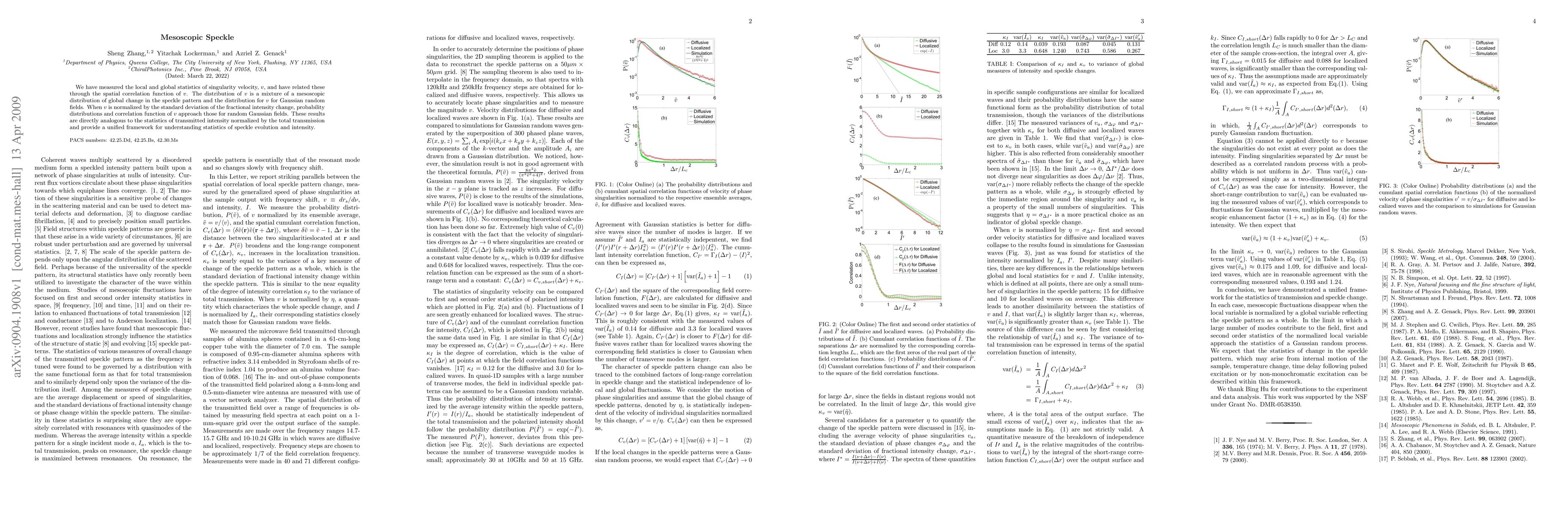 We have measured the local and global statistics of singularity velocity, v, and have related these through the spatial correlation function of v. The distribution of v is a mixture of a mesoscopic distribution of global change in the speckle pattern and the distribution for v for Gaussian random fields. When v is normalized by the standard deviation of the fractional intensity change, probability distributions and correlation function of v approach those for random Gaussian fields. These results are directly analogous to the statistics of transmitted intensity normalized by the total transmission and provide a unified framework for understanding statistics of speckle evolution and intensity.